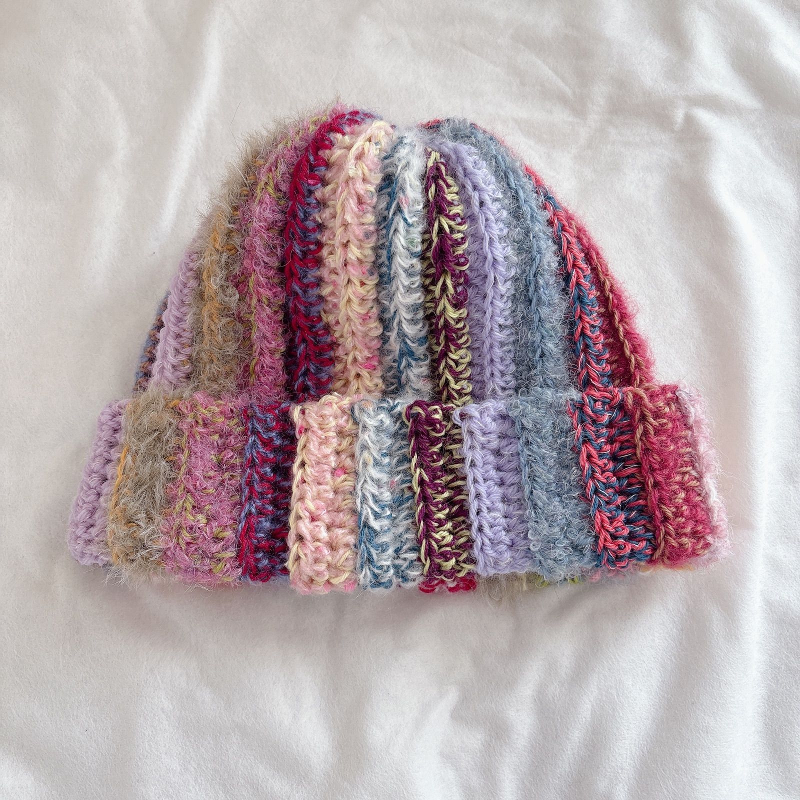 【ハンドメイド・完成品】ニット帽 ビーニー マルチカラー ランダム模様 異素材 毛糸 編み物 カラフル ユニセックス メンズ レディース 古着 ストリート