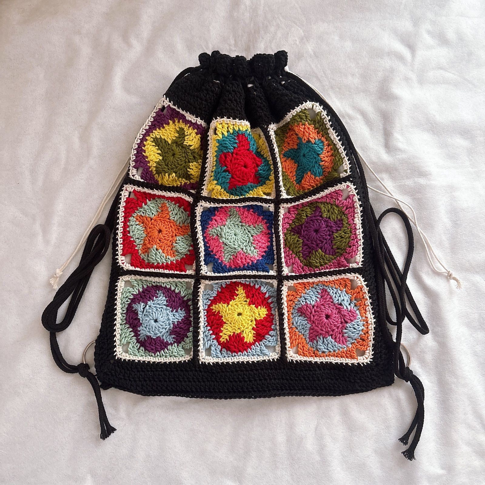 【ハンドメイド・完成品】ナップサック リュック バッグ メッシュ 星 編み物 黒