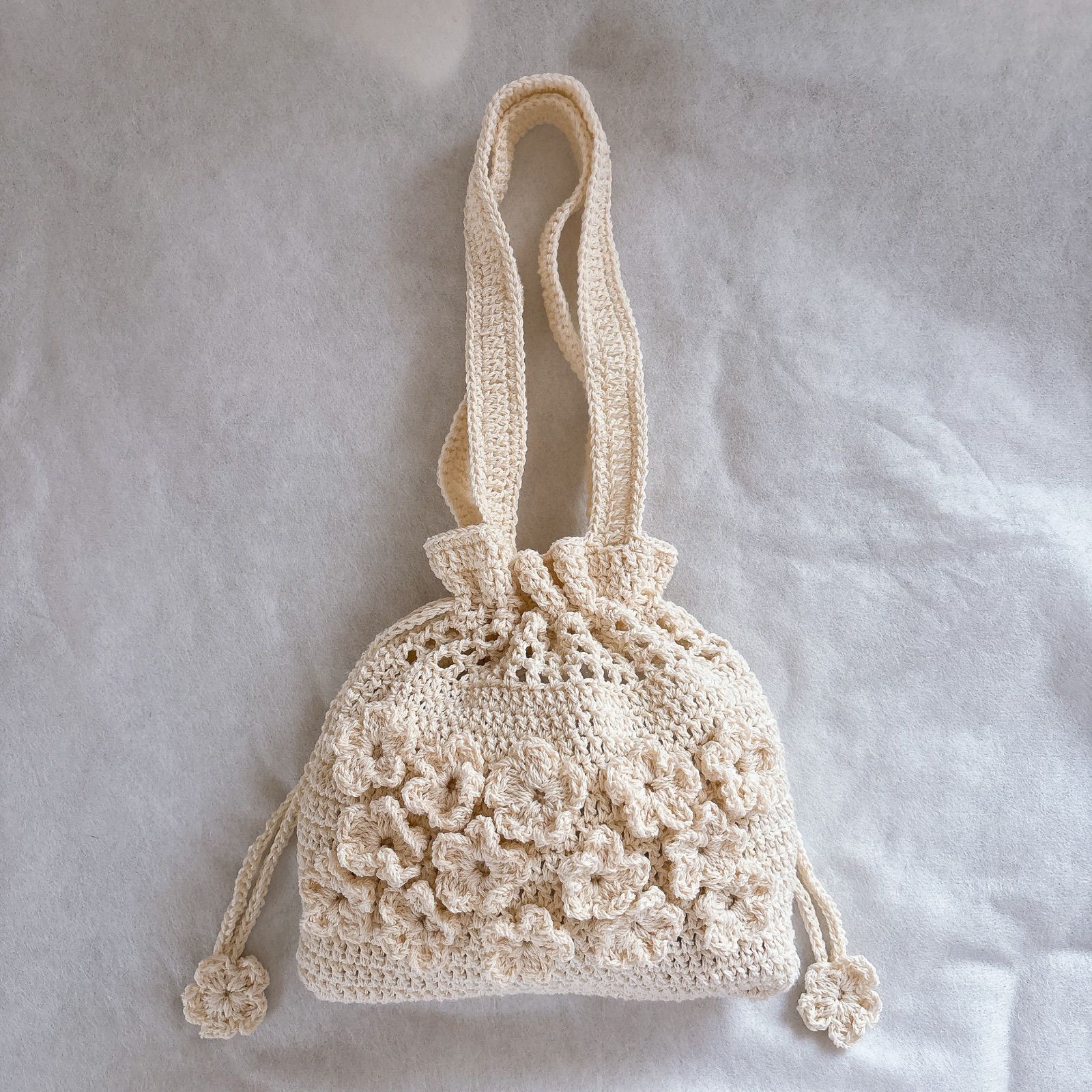 【ハンドメイド・完成品】クロシェバッグ 巾着バッグ フラワー モチーフ お花 アイボリー 編み物 コットン バッグ ショルダーバッグ トートバッグ