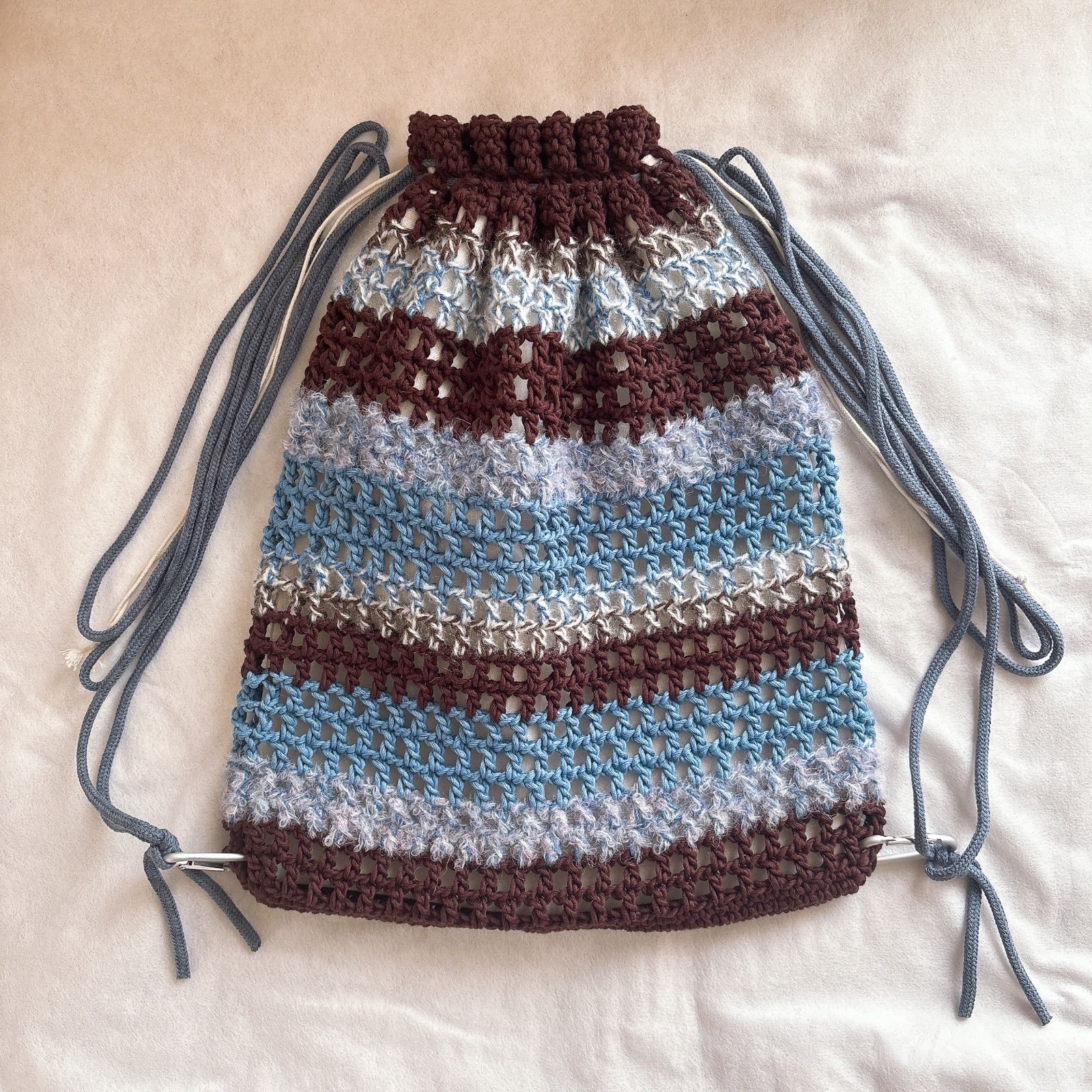 【ハンドメイド・完成品】ナップサック メッシュナップサック リュック バッグ ブラウン ブルー スカイブルー 水色 青 茶色 内布付き 肩紐付き