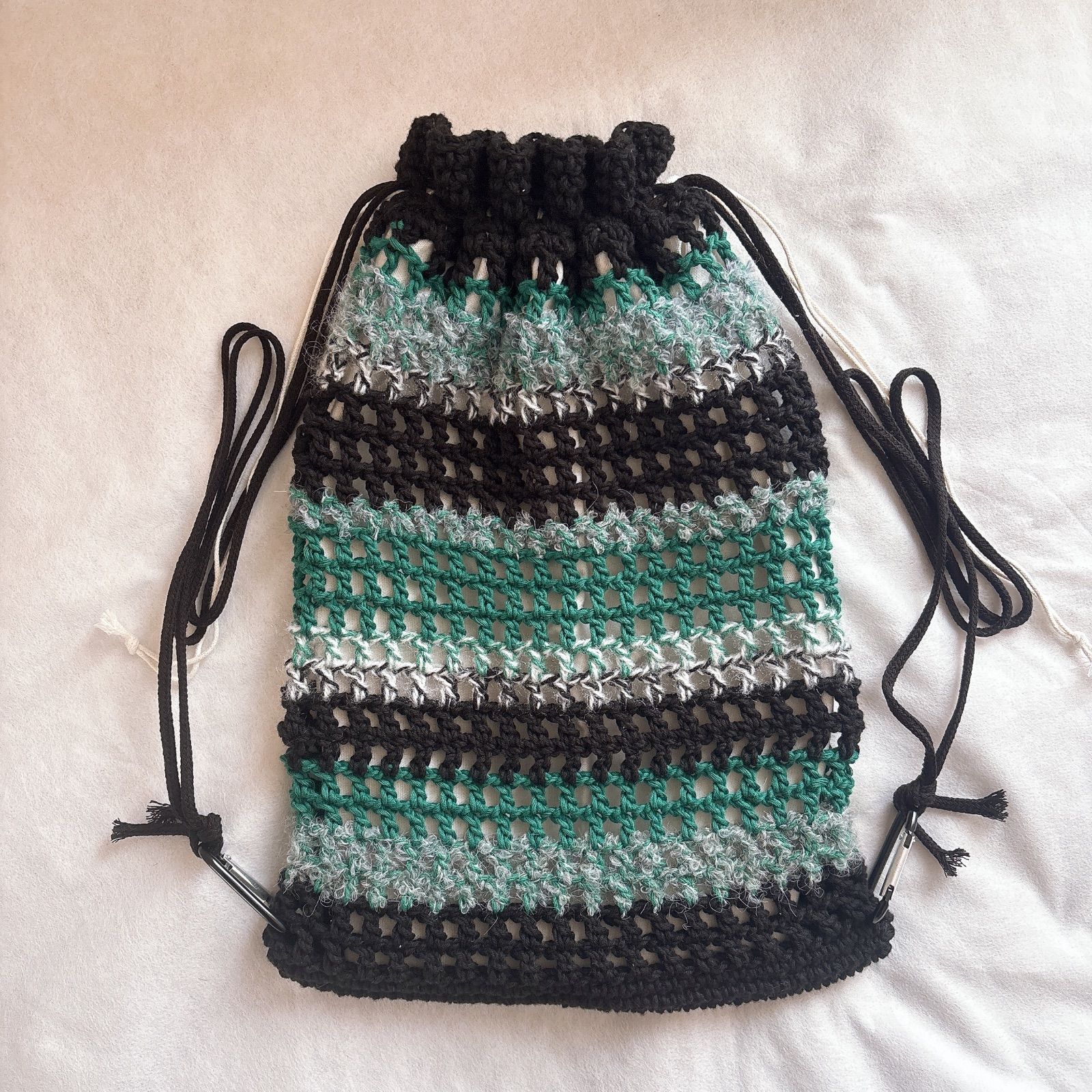 【ハンドメイド・完成品】ナップサック メッシュ 緑 黒 編み物 バッグ リュック