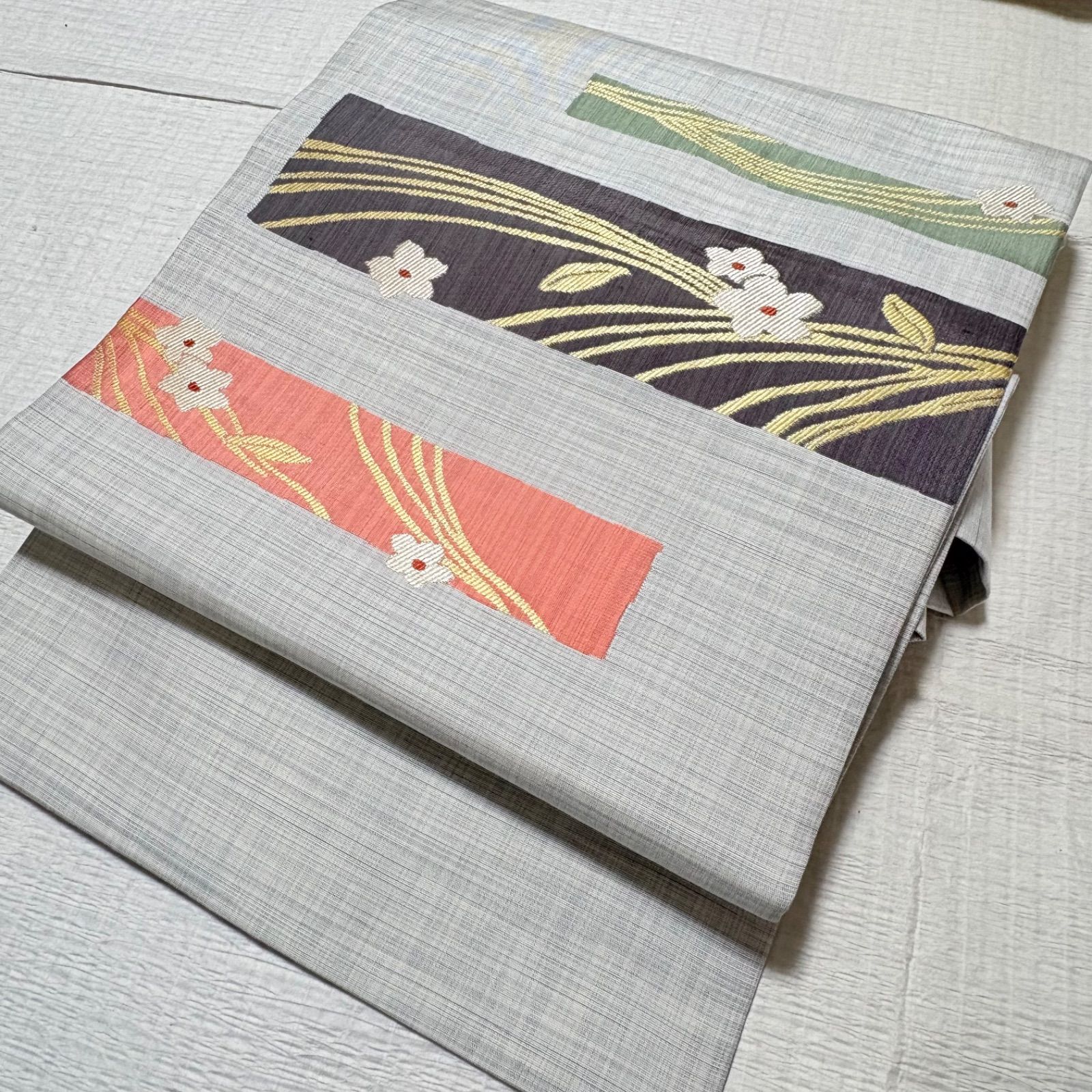 【九寸名古屋帯】白+薄グレーの地に可愛い小花柄・良品・カジュアルなお着物に♪