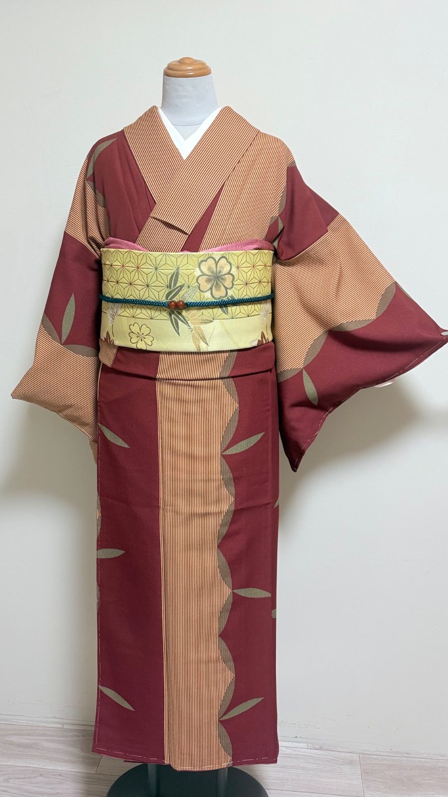 【洗える小紋】未使用新古品・しつけ付き・ボルドーカラーにマスタードイエロー・裄63㎝