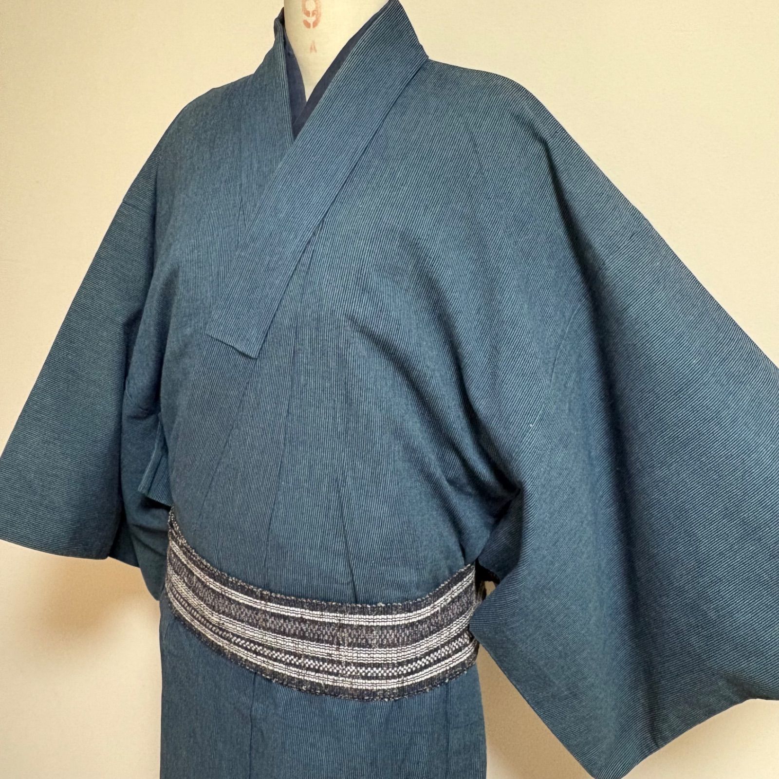 【現代の名工鈴木榮治氏愛蔵品】男物・単衣・木綿・メンズ着物・青紺細縞・裄69.5㎝・肩身丈140㎝