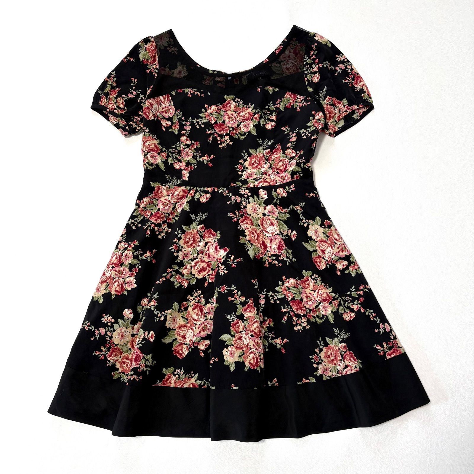 & by P&D 花柄 チュール切替 ワンピース 半袖 38 ブラック ローズ M