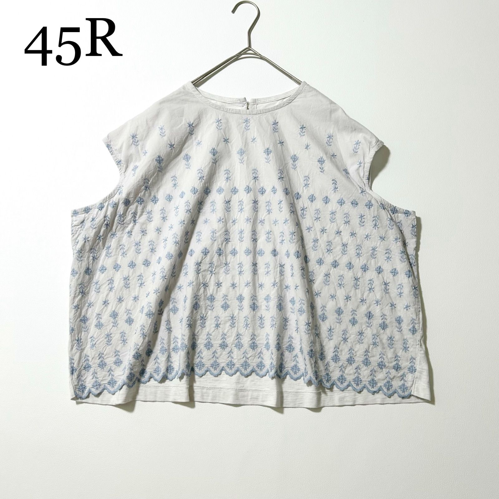 3477y美品 45R ハケ目カットワーク天竺Mキャミ コットン刺繍ブラウス ライトグレー
