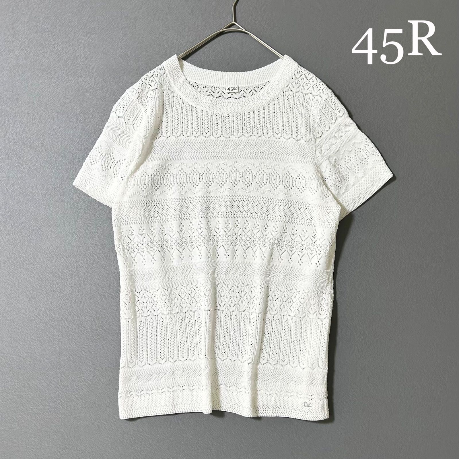 3437y美品 45R コットンレース編みの半袖サマーニット 白 M