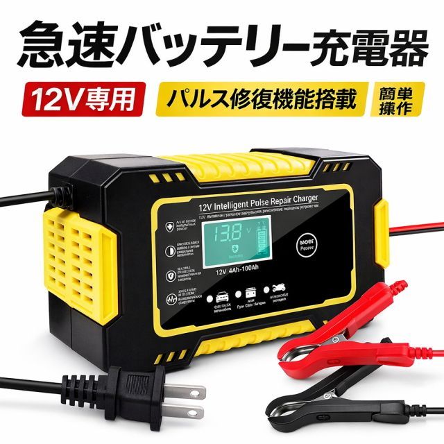 急速バッテリー充電器 イエロー 12V専用 パルス修復機能搭載 コンパクト 軽自動車 バイク対応 簡単操作 デジタル表示 高性能 チャージャー
