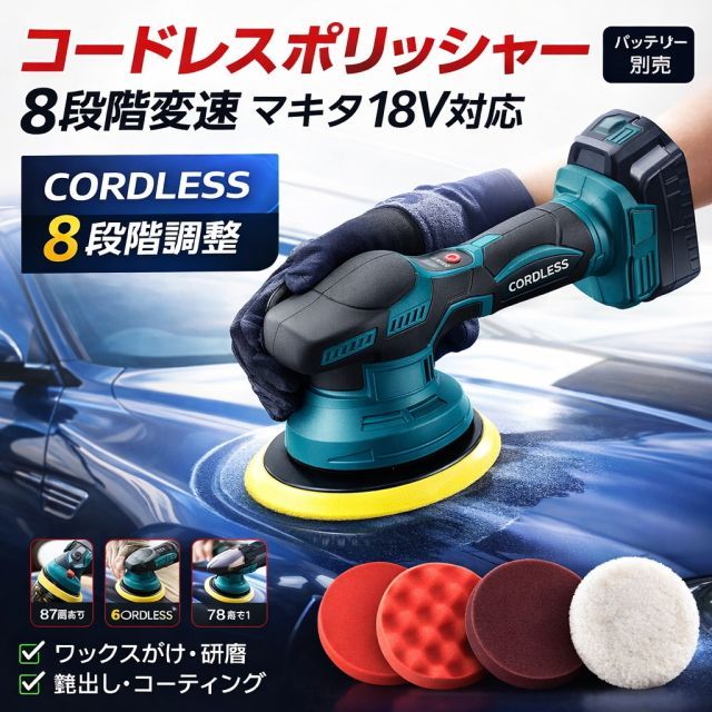 マキタ18Vバッテリー互換 ダブルアクションポリッシャー コードレス 8段階変速 デジタル表示 研磨 ワックス磨き 洗車 傷消し 軽量 簡単操作
