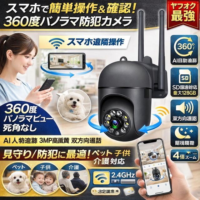 最新360度防犯カメラ 限定色ブラック スマホ遠隔操作 AI人物追跡 3MP高画質 双方向通話 WiFi対応 見守り ペット 子供 介護 SD録画 夜間対応