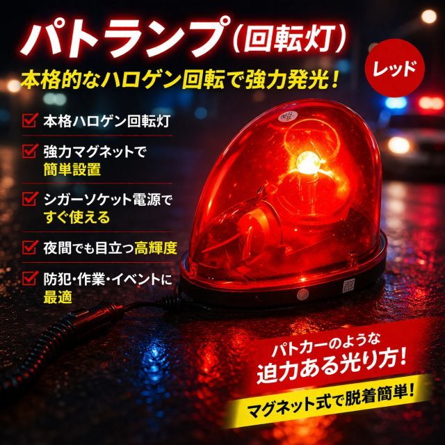 パトランプ 赤 回転灯 ハロゲン 本格仕様 マグネット式 シガー電源 12V 車用 警告灯 防犯 作業灯 パトカー風 高輝度 リアル発光 即使用可能
