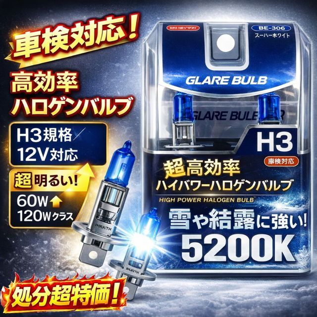 超特価 ブレイスグレアーバルブ H3 BE-306 5200K スーパーホワイト 12V車用 高効率ハロゲン 車検対応 60W→120Wクラス ヘッドライト 白色光