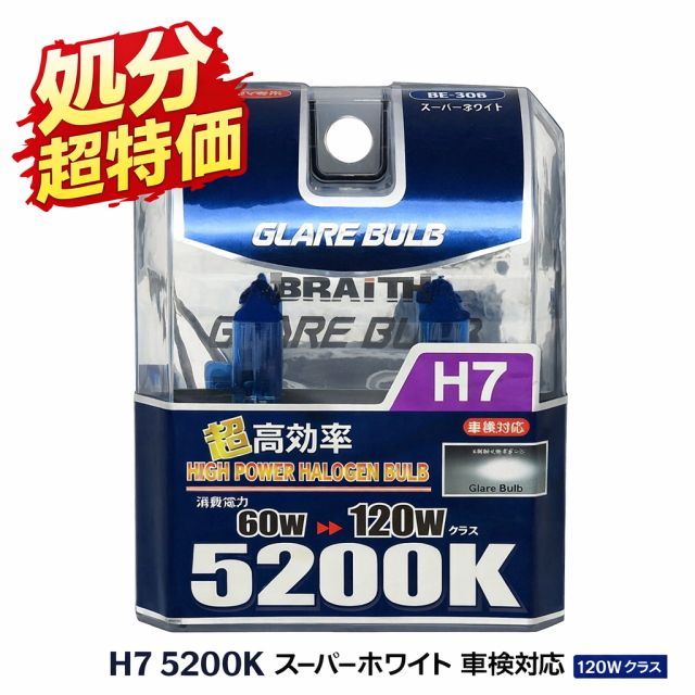 超特価 ブレイスグレアーバルブ H7 BE-308 5200K スーパーホワイト 12V車用 高効率ハロゲン 車検対応 60W→120Wクラス ヘッドライト 白色光
