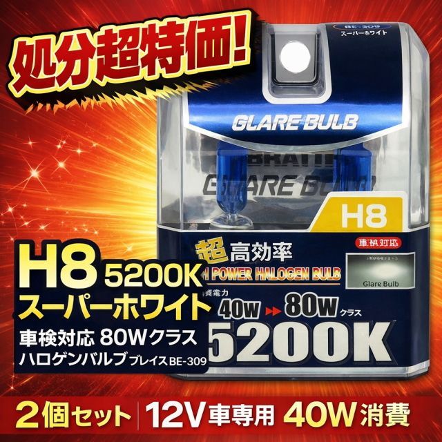 超特価 ブレイスグレアーバルブ H8 BE-309 5200K スーパーホワイト 12V車用 高効率ハロゲン 車検対応 40W→80Wクラス ヘッドライト 白色光