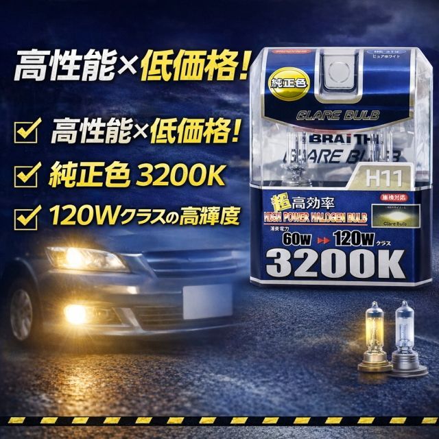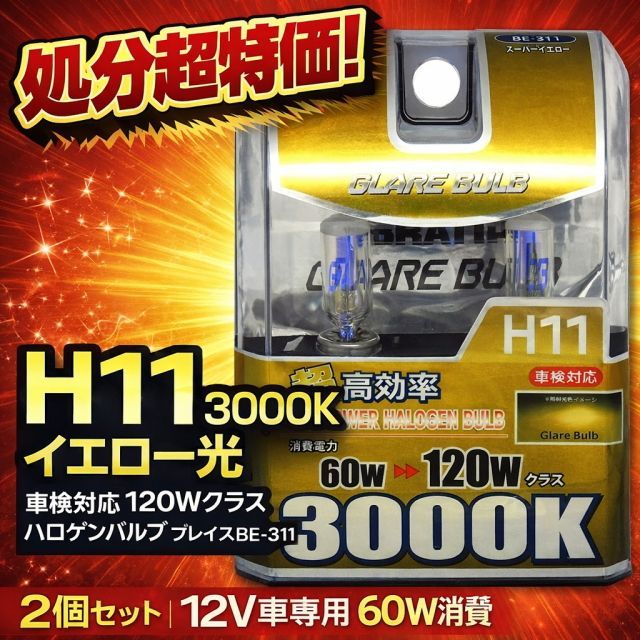 超特価 H11 3000K スーパーイエロー 120Wクラス ハロゲンバルブ 2個セット フォグランプ 雨雪霧に強い 視認性抜群 ブレイス BE-311車検対応