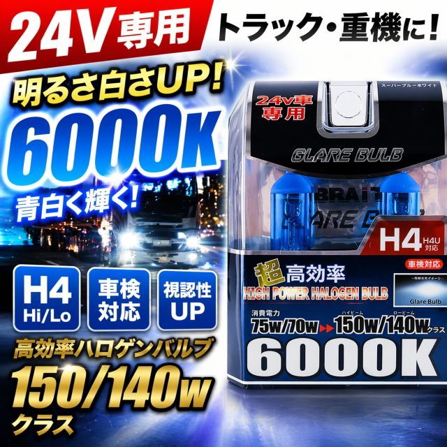 超特価 BE-317 24V専用 H4ハロゲンバルブ 6000K Hi/Lo対応 150/140Wクラス 明るさUP トラック重機 車検対応 高効率 高輝度バルブ 2個セット