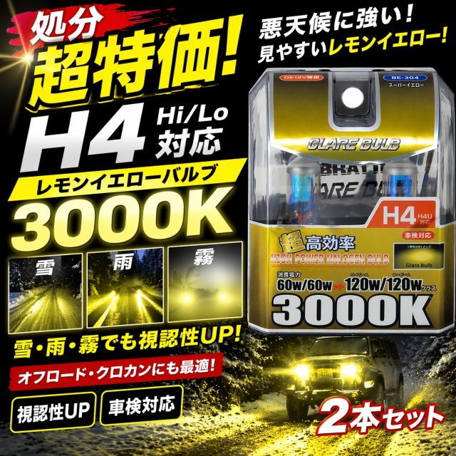処分超特価 H4 レモンイエロー3000K ハロゲンバルブ Hi/Lo対応 雪雨霧に強い 視認性UP 2本セット フォグ代用 オフロード クロカン 車検対応