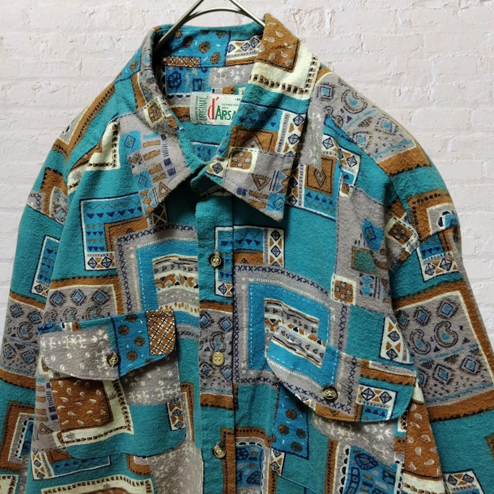 昭和レトロ ストリート パッチワーク風 クレイジーパターン 長袖シャツ バンダナ柄 民族柄 幾何学模様 ターコイズブルー系