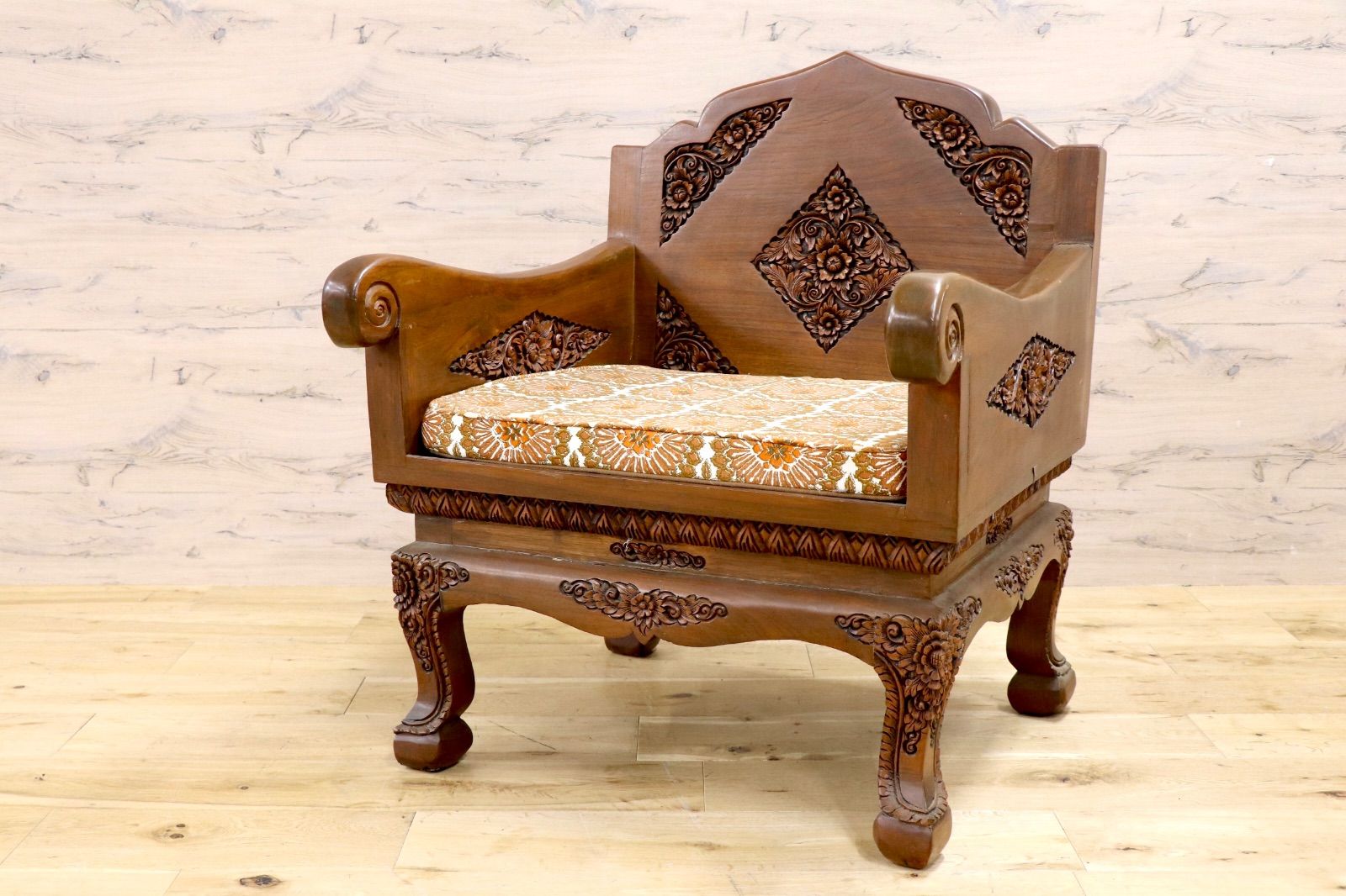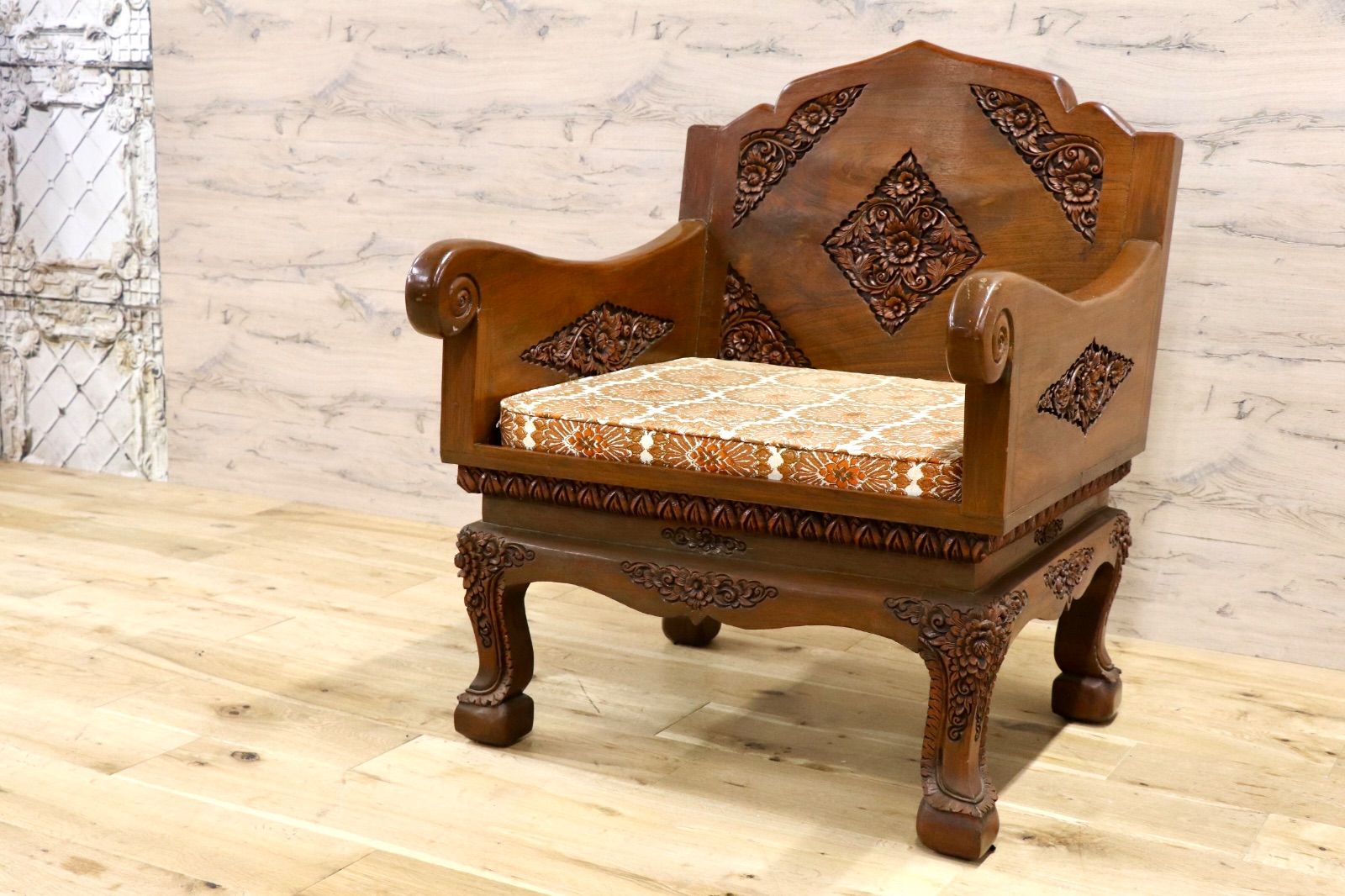 GMJS22A○アジアンヴィンテージ 手彫り アームチェア 椅子 花柄 カーヴィング ファブリック 無垢材 木製家具