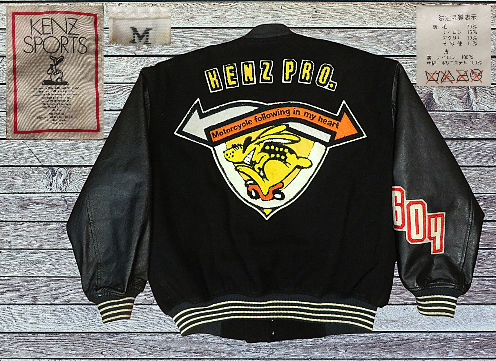✅️ 人気のブラック Mサイズ KENZ SPORTS ケンツ スポーツ 背中特大ワッペン 袖革 レザー スタジャン アワードジャケット スタジアムジャンパー バイク オートバイ Motorcle バイカー BLACK
