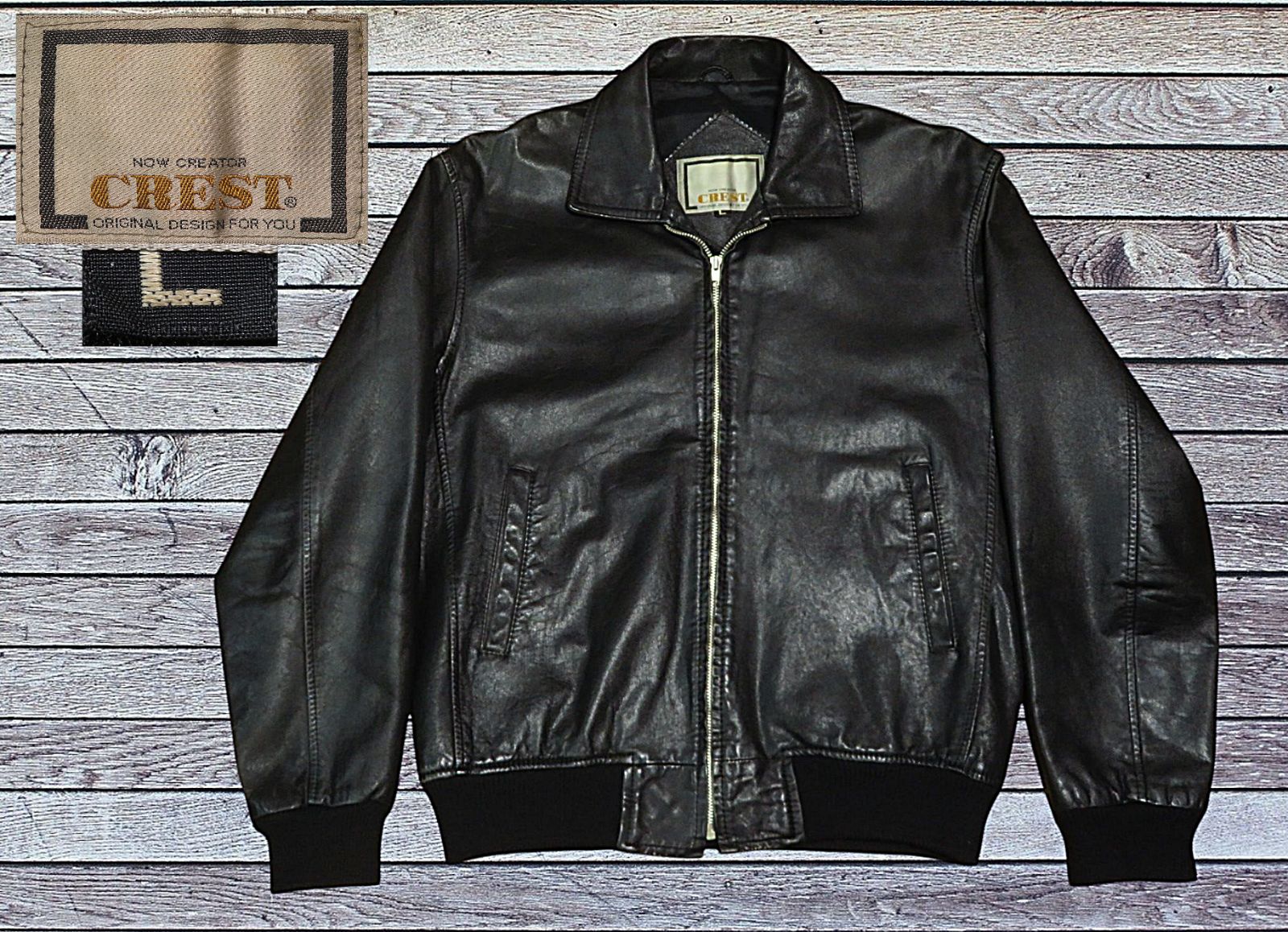 ✅️ 当時物 Lサイズ CREST クレスト ジャパン ビンテージ 襟付き レザーブルゾン リブジャン レザージャケット ロカビリー 好きにBLACK 黒 ロック