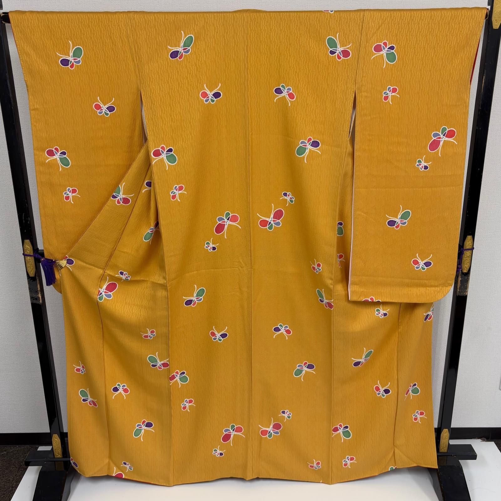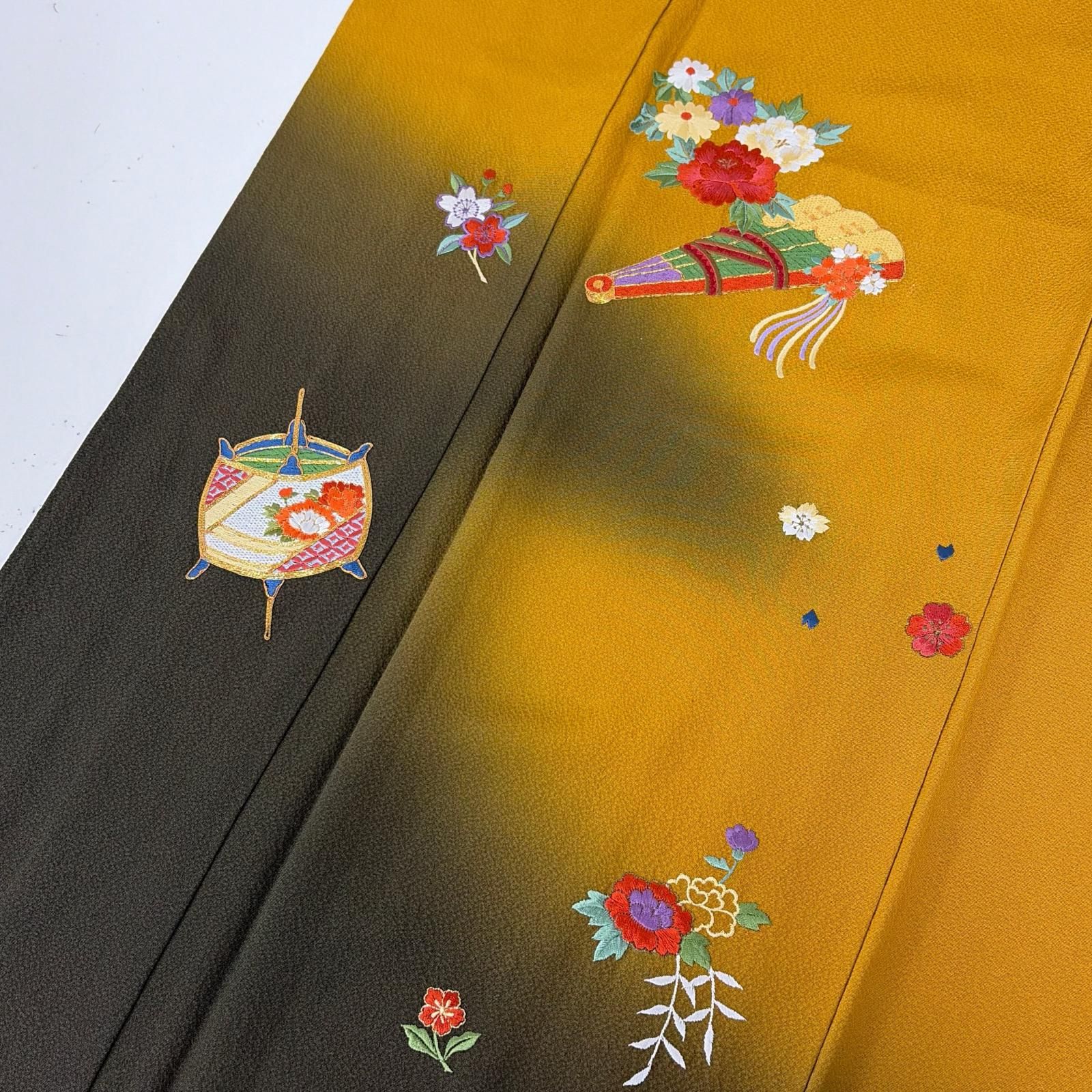 付下げ 刺繍 裄65.5 からし色 上品な加工 紋無し 正絹 着物 MK-7050