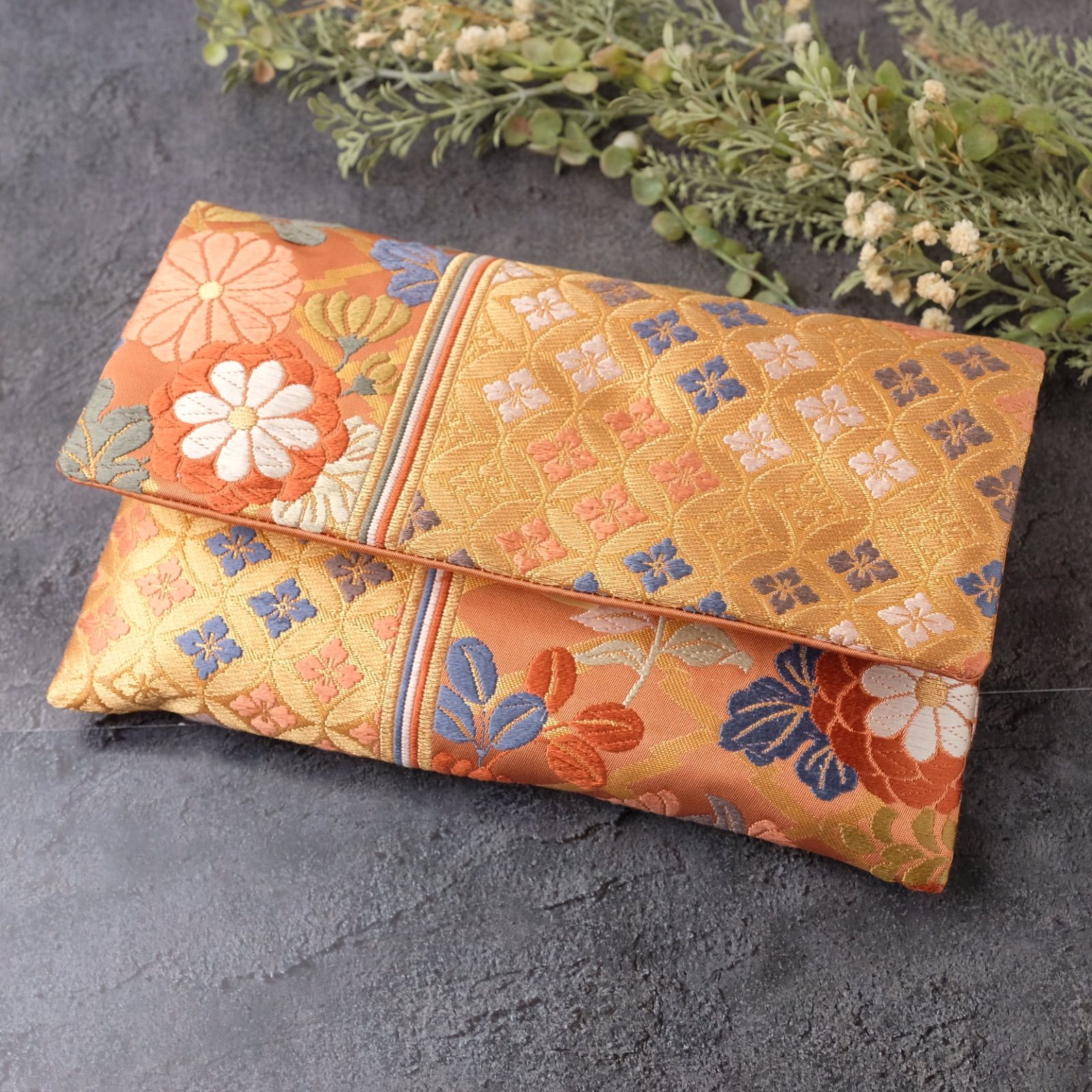 御朱印帳ケース 帯リメイク 袱紗タイプ 御朱印帳入れ 和柄 オレンジピンク 唐織 一点物 G-25-169 ハンドメイド