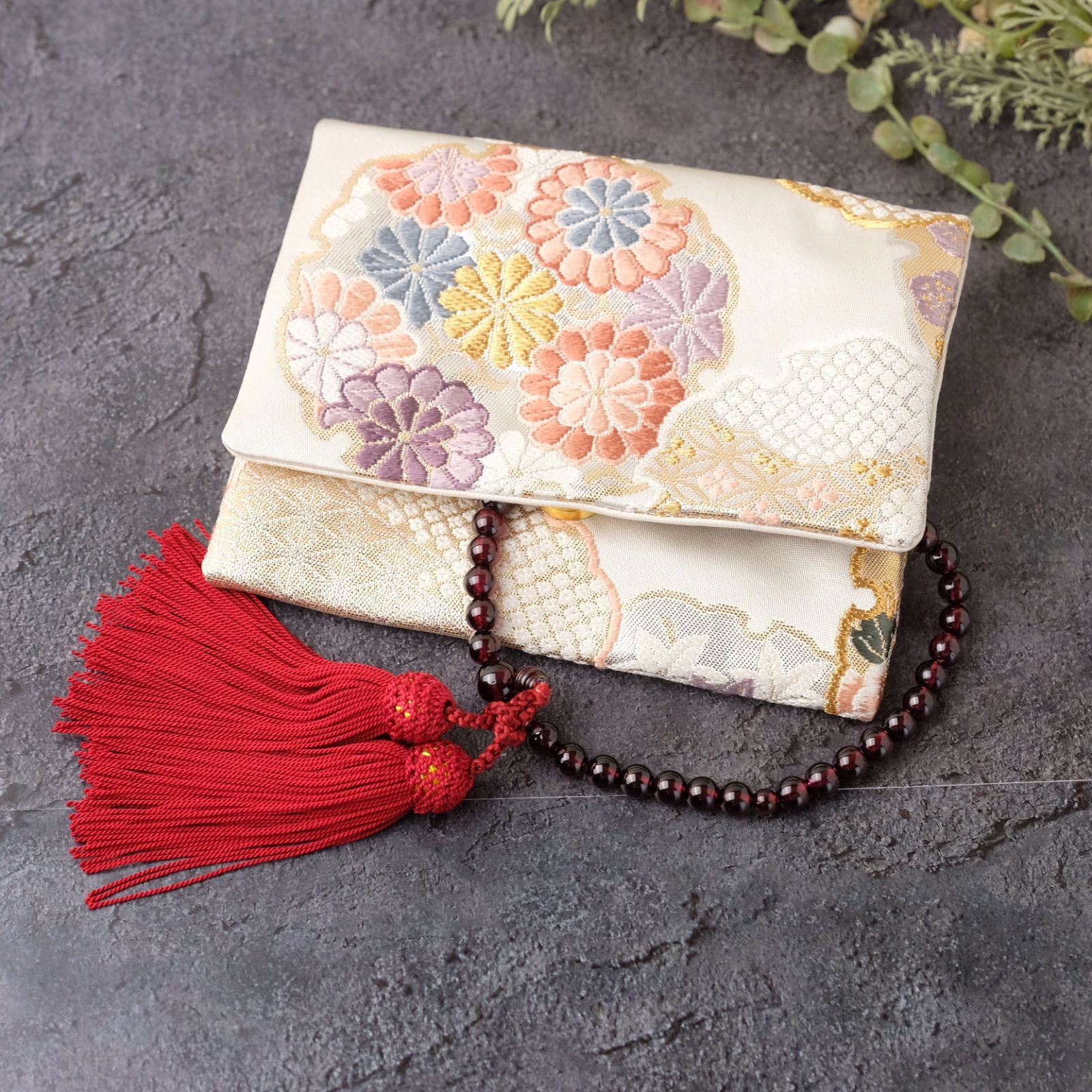帯リメイク 数珠入れ 数珠ケース 念珠入れ 一点物 和柄 和風 白 花柄 上品 フォーマル ハンドメイド J-15-113