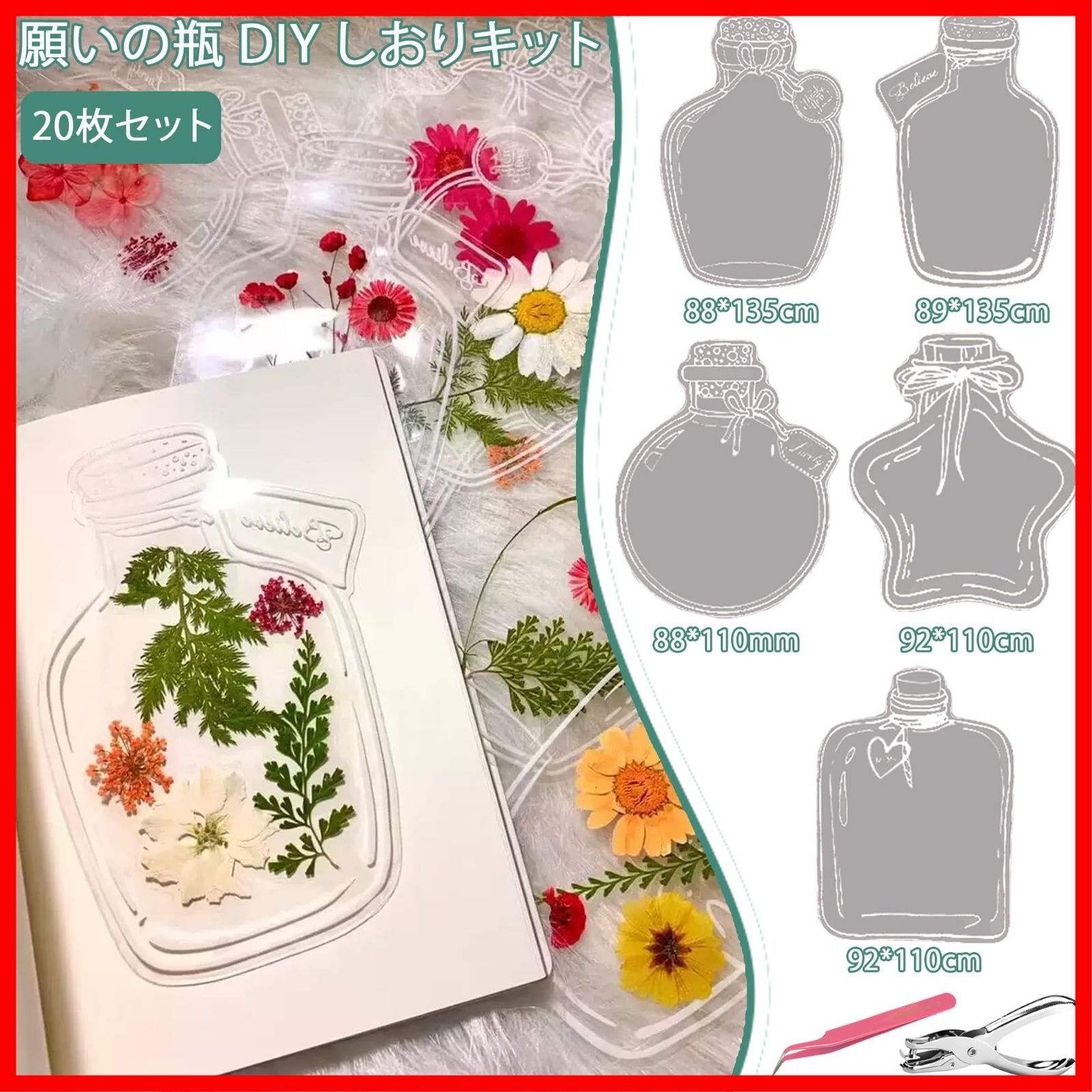 DELUXEFOX しおりキット 20枚セット ドライフラワーのしおり 押し花 しおり 押し花キット 可愛い しおり おしゃれ 透明ブックマーク 可愛い ボトル 植物標本 しおり 手帳用 読書用レゼント用 DIY 手作り 幼稚園 大人用 子供用 ホームスクール用品 文房具読む タッセル*20 穴あけパンチ ピンセット