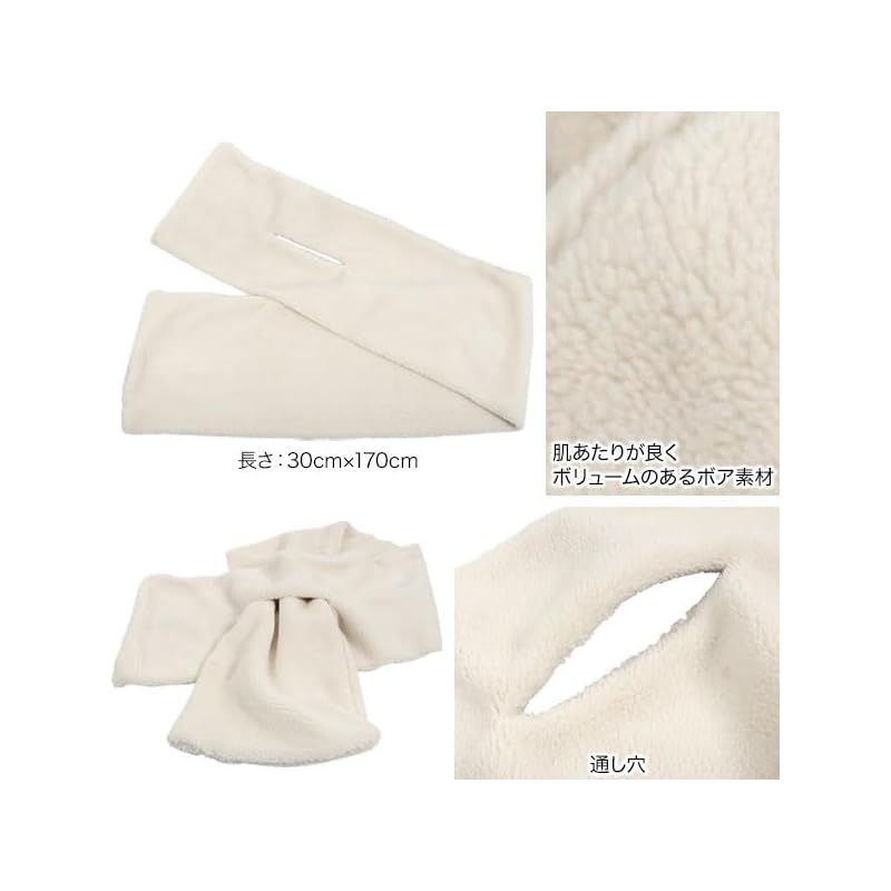 秋冬に大活躍間違いなしのボアストールの登場。適度な厚さで暖かさがあり、さっと巻くだけでスタイリングのアクセントに。通し穴があるので、肩から落ちにくいのも魅力のひとつ。マフラー使いとしてはもちろん、ストール使いやひざ掛けとしても便利なアイテムです。