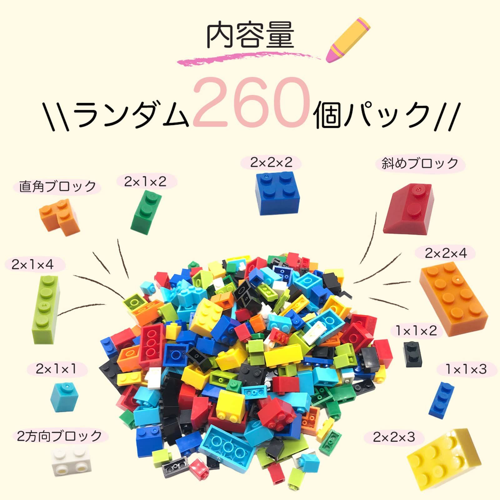 【基本ブロック 260ピース】大手ブロックと同サイズで作られているので、既にお持ちのものと一緒に遊ぶことができます。