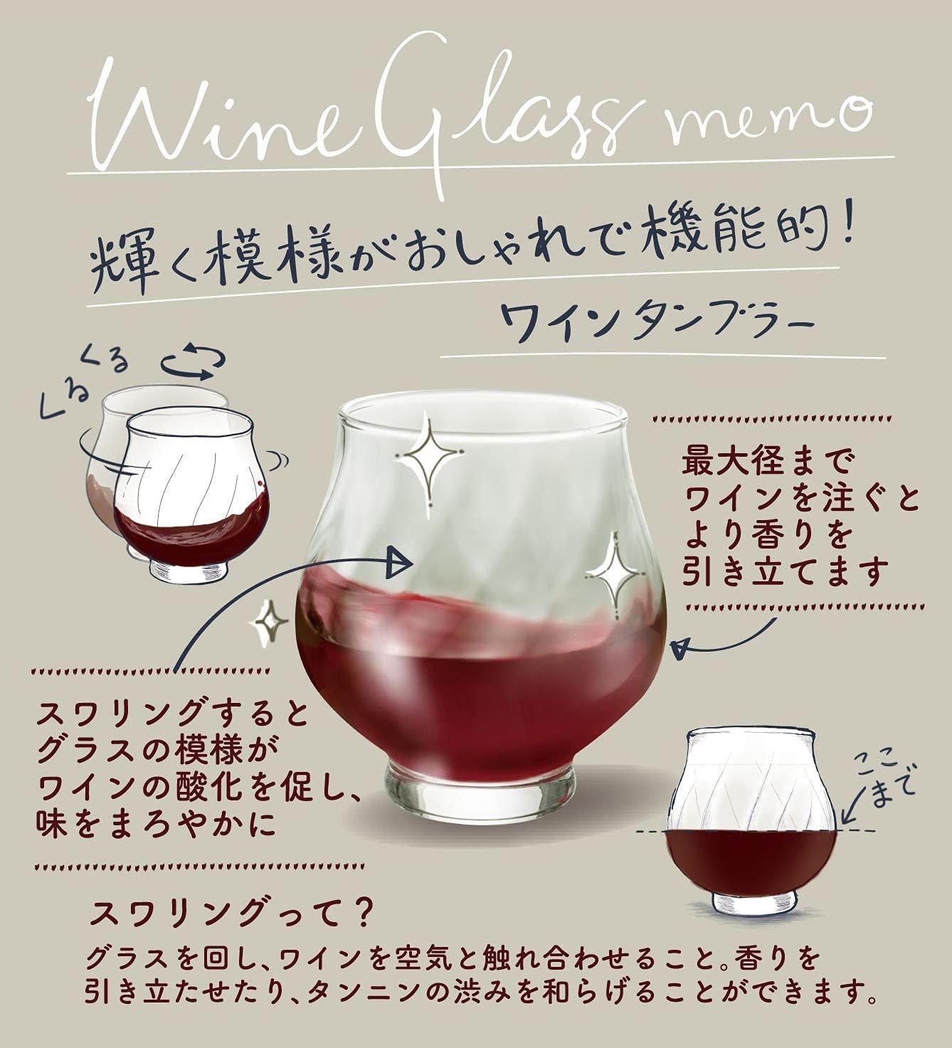 ●輝く模様がおしゃれで機能的なワインタンブラーです。●ワイン(果実酒)を気軽に、さらに本格的に味や香りも楽しめるワイングラスシリーズです。●キラキラ輝く模様とコロンとした形状が特徴のグラスが新登場しました。●スワリングするとグラスの模様がワインの酸化を促し、味をまろやかにしてくれます。●箱入りなので、ちょっとしたプレゼントにもおすすめです。