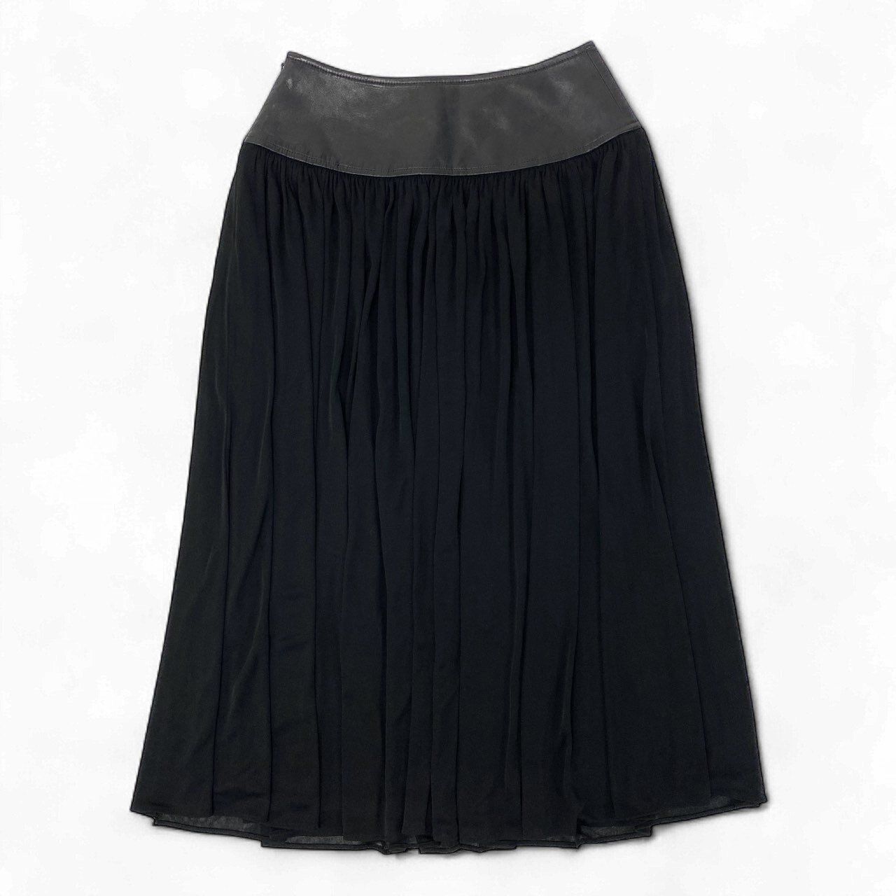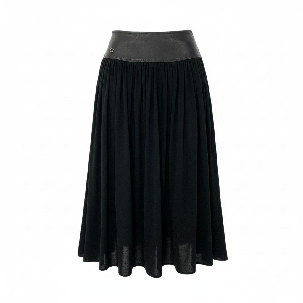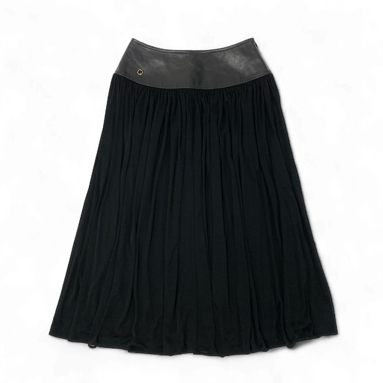 ブラック×本革ウエストのコンビ素材が上品なレオナールのギャザースカートです。マットな黒のカンカン素材は軽く揺れる質感で、歩くたびに綺麗なドレープが出る女性らしい一着。本革ウエストの切り替えと小さなゴールド金具がさりげないアクセントになっています。Tシャツ合わせのカジュアルからブラウスとの上品コーデまで幅広く活躍。シーズン問わず使える万能ブラックスカートです。