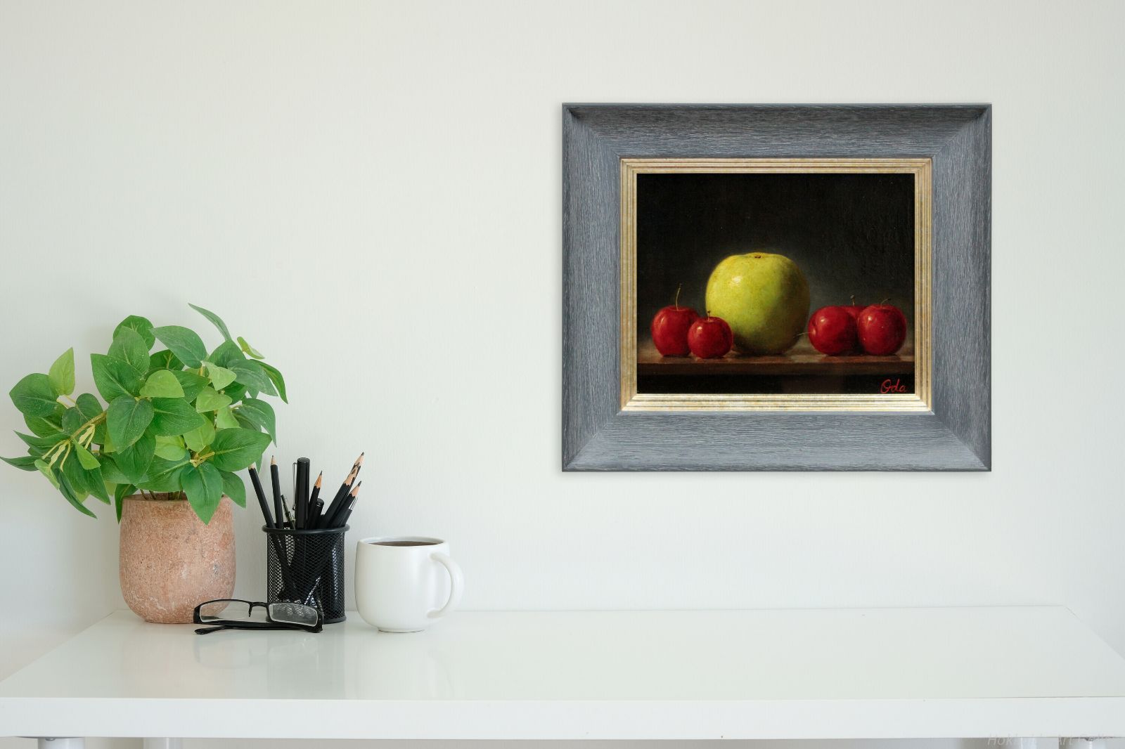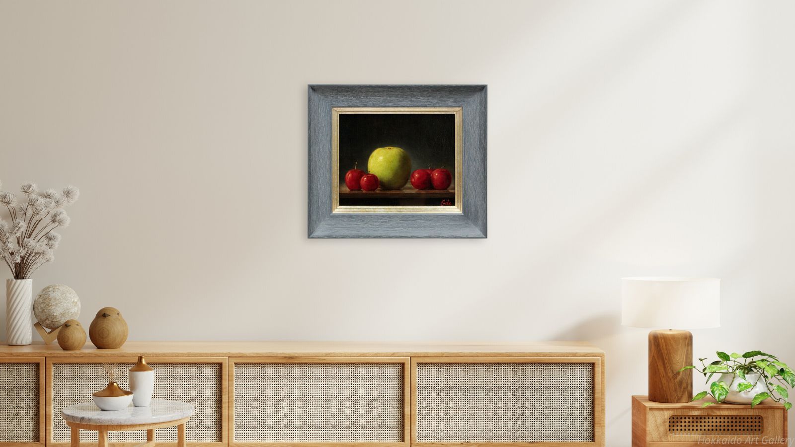 瑞々しい赤と、確かな質量を思わせる緑のリンゴ。繊細な筆致が個々の生命感を画面に深く刻み、穏やかな美しさを伝えています。