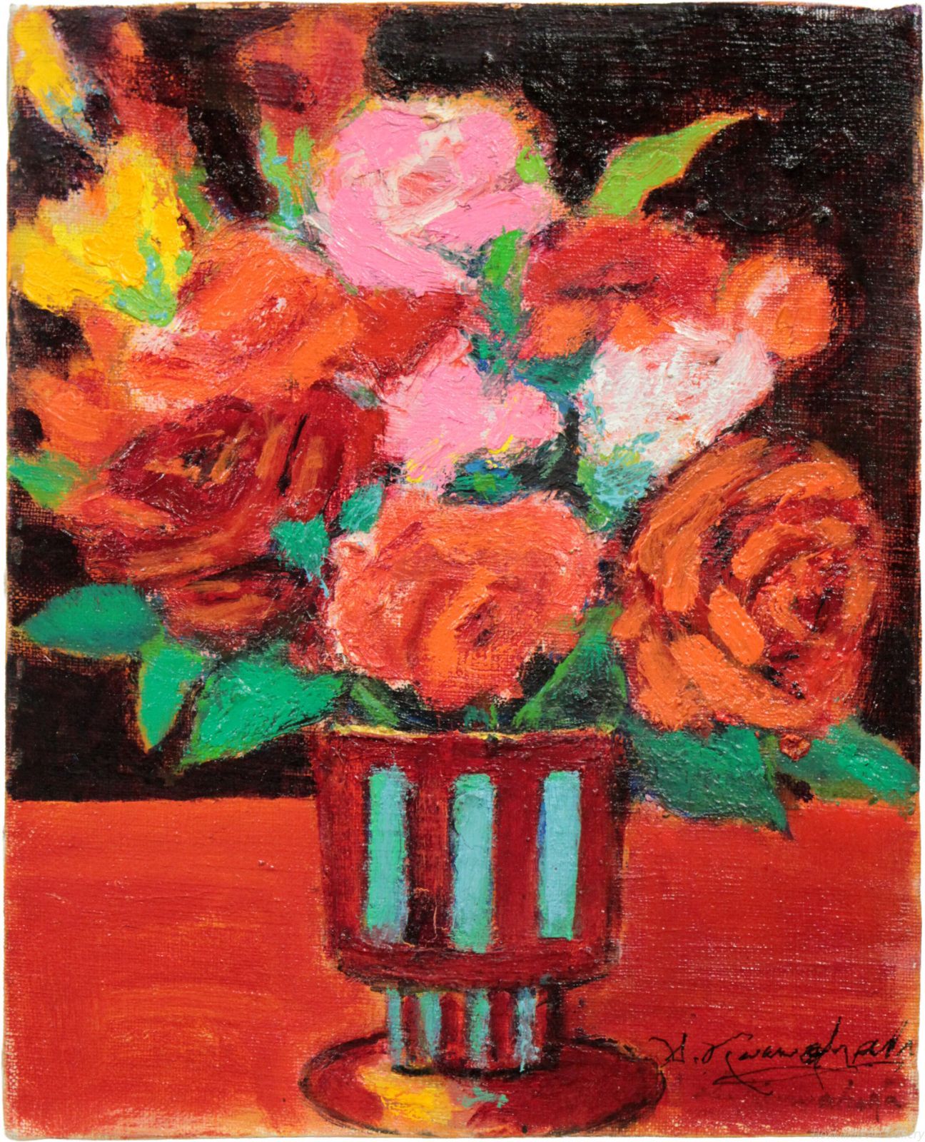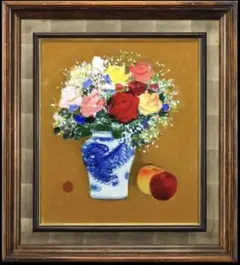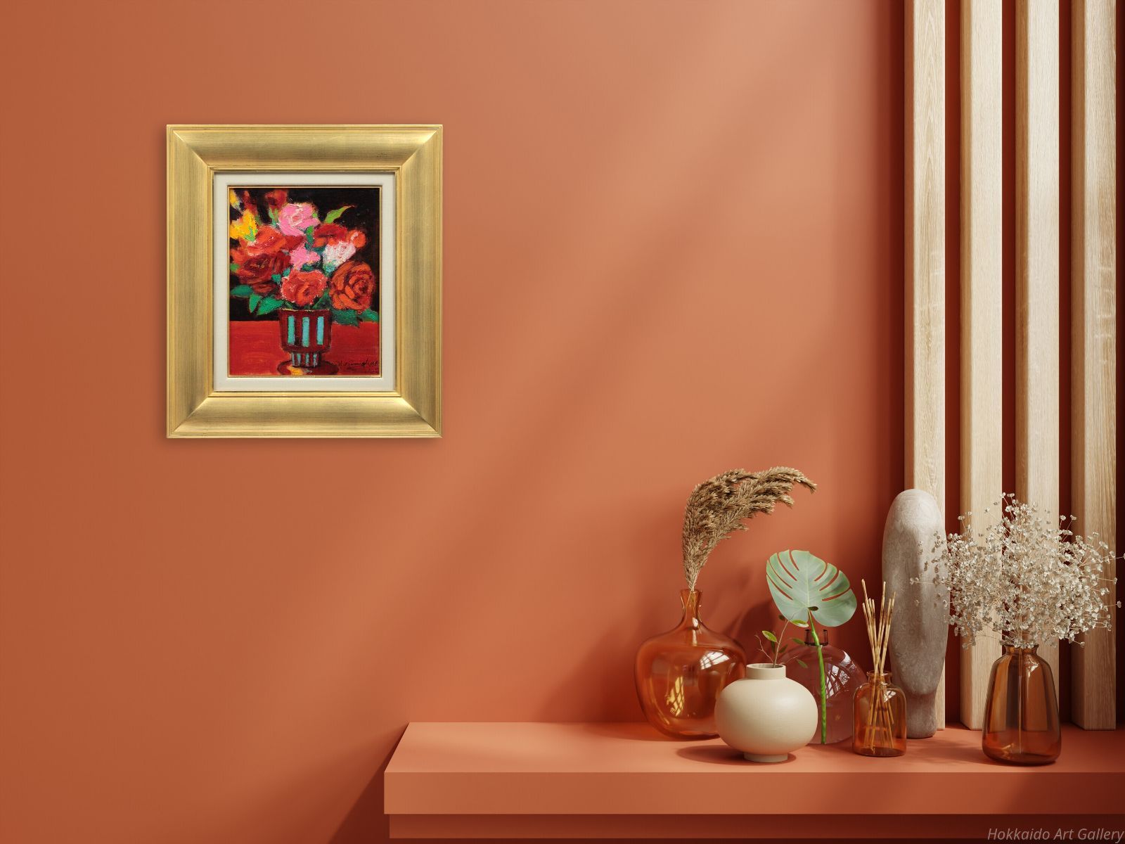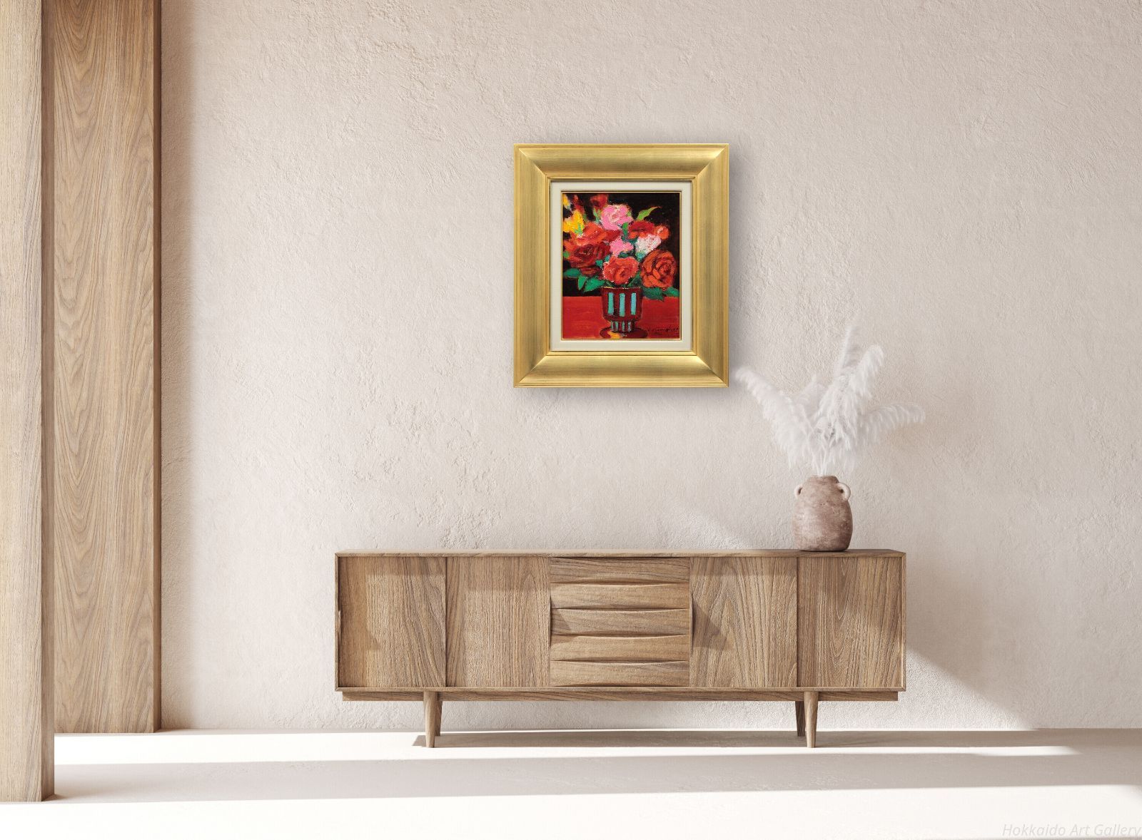 厚塗りのマチエールと鮮やかな色彩で描かれたバラの花束。甘い香りが漂いそうな生命力あふれる表現が、空間を豊かに彩ります。