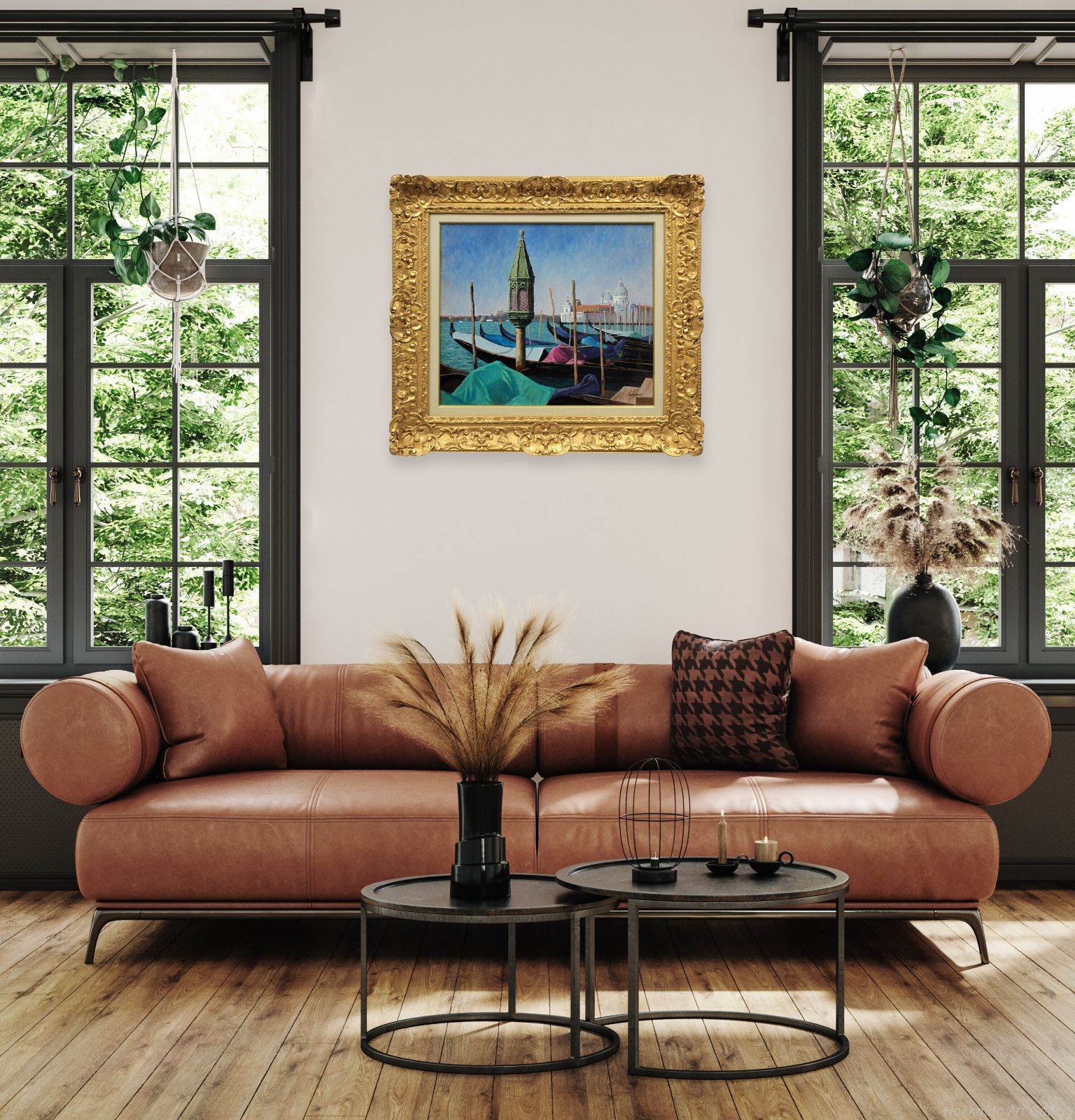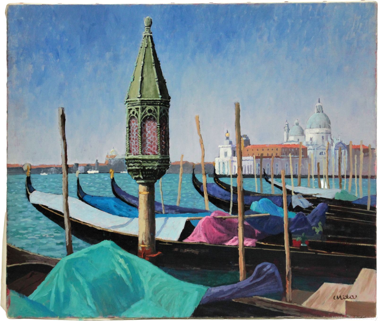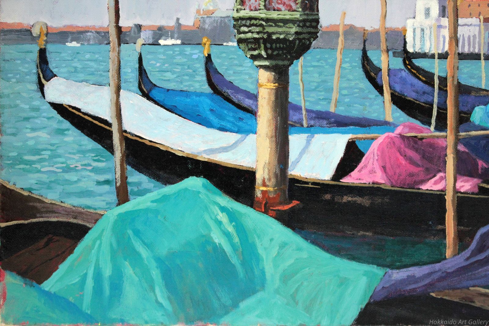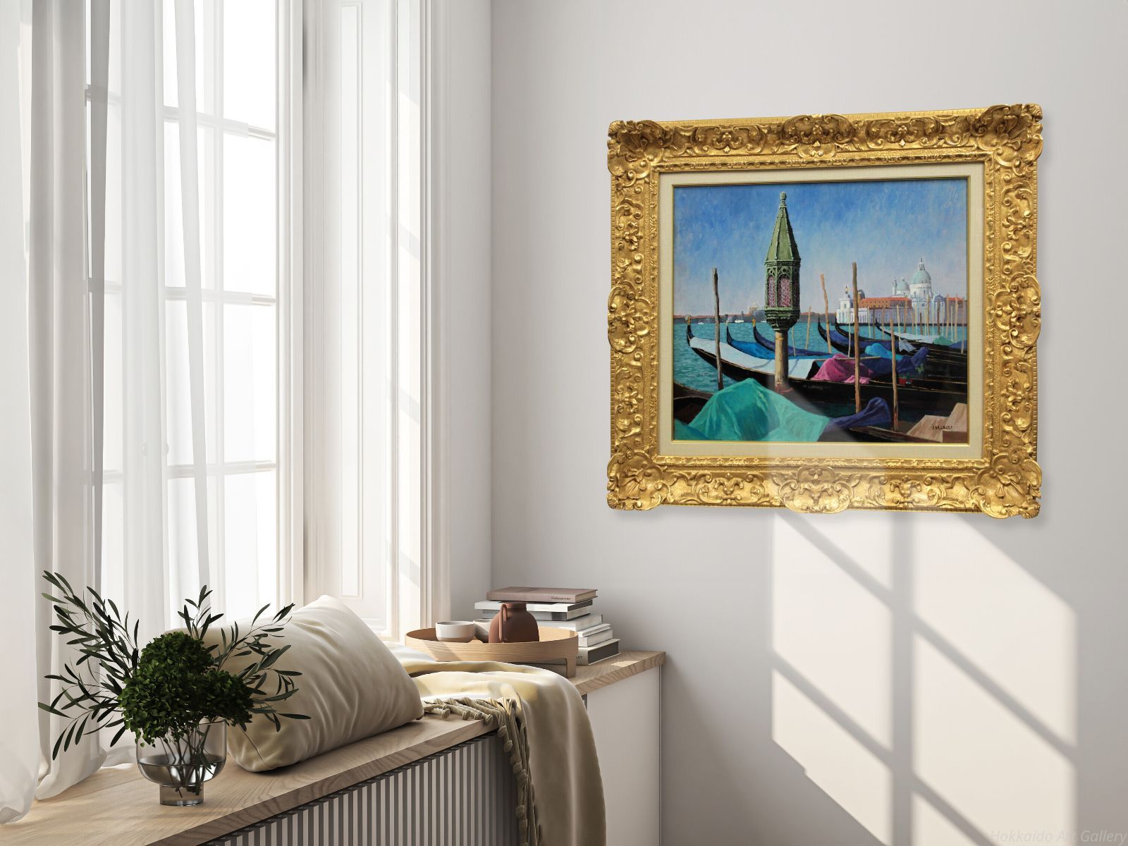 ゴンドラが停泊する水都の情景が、澄んだ光と鮮やかな色彩で穏やかに描かれています。ベネチアの聖堂が優雅な風情を添える一枚です。