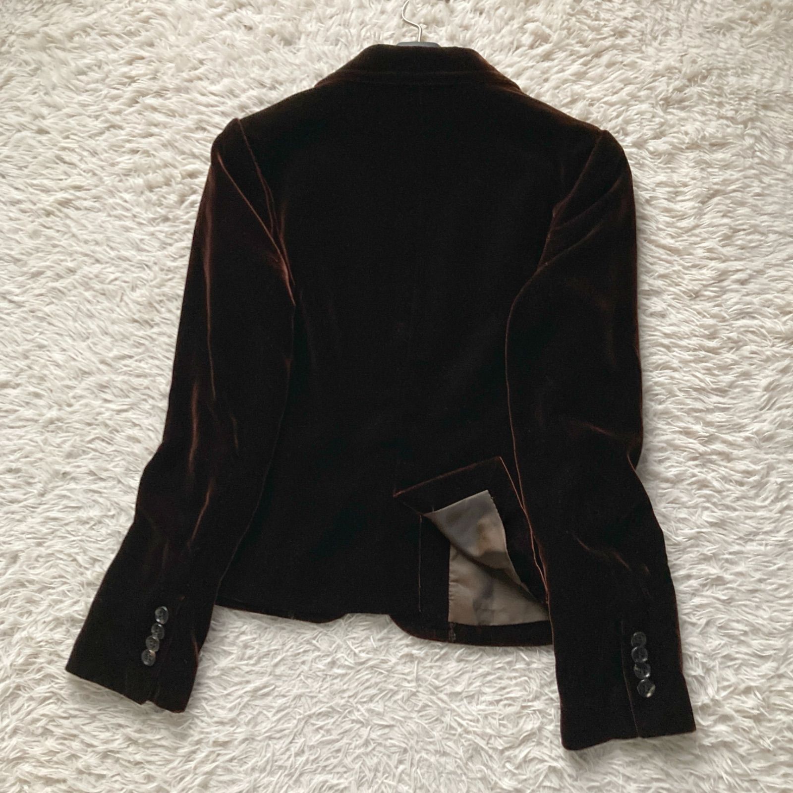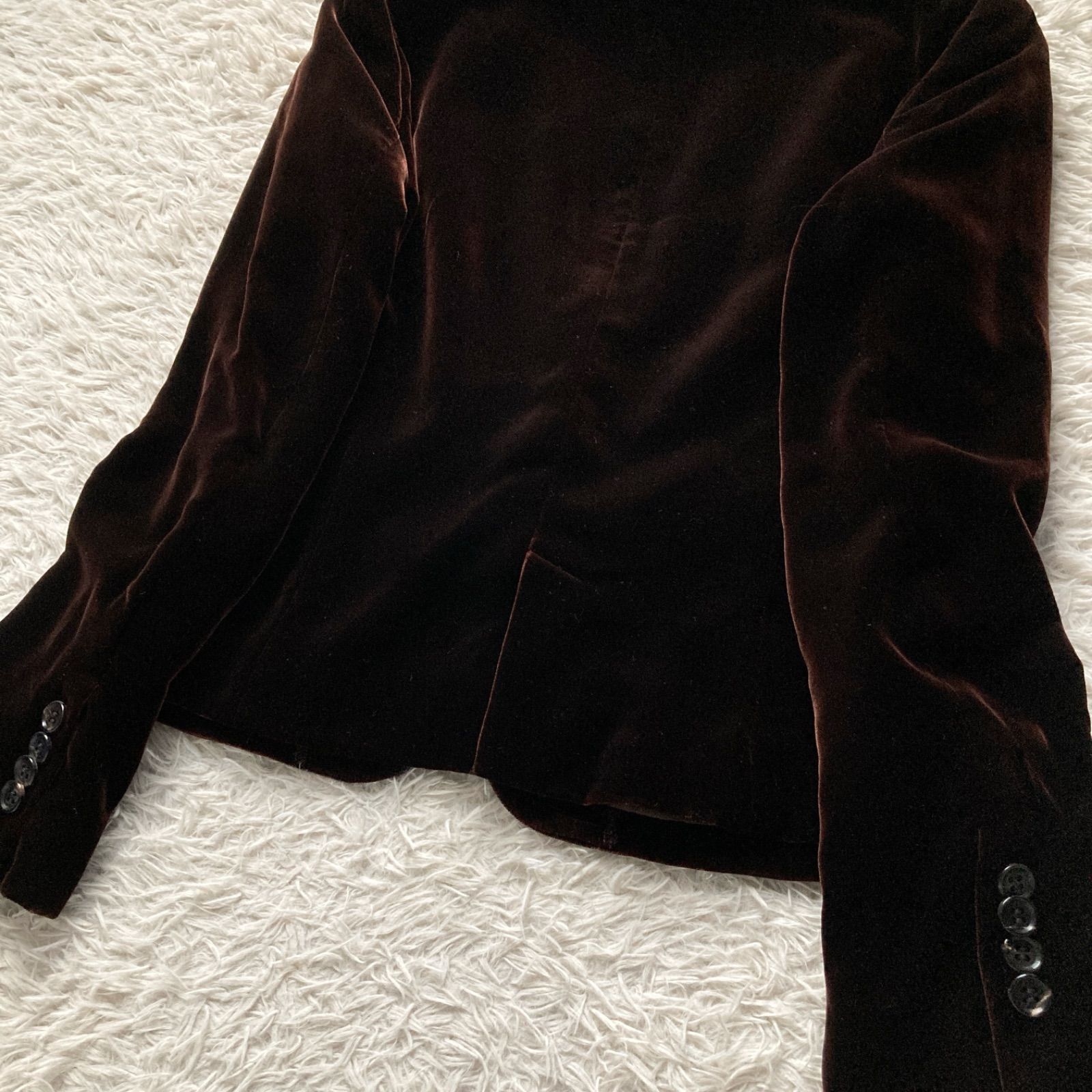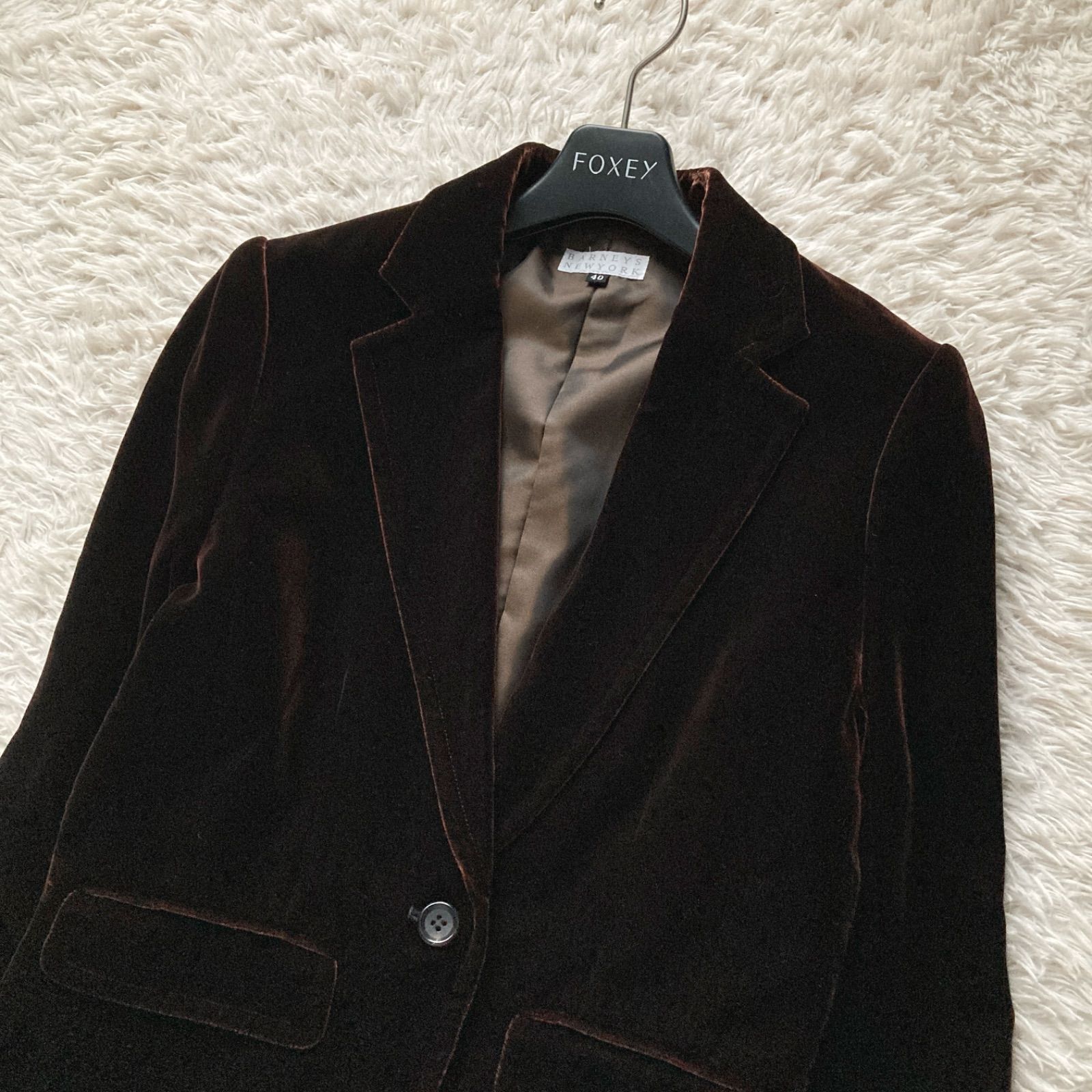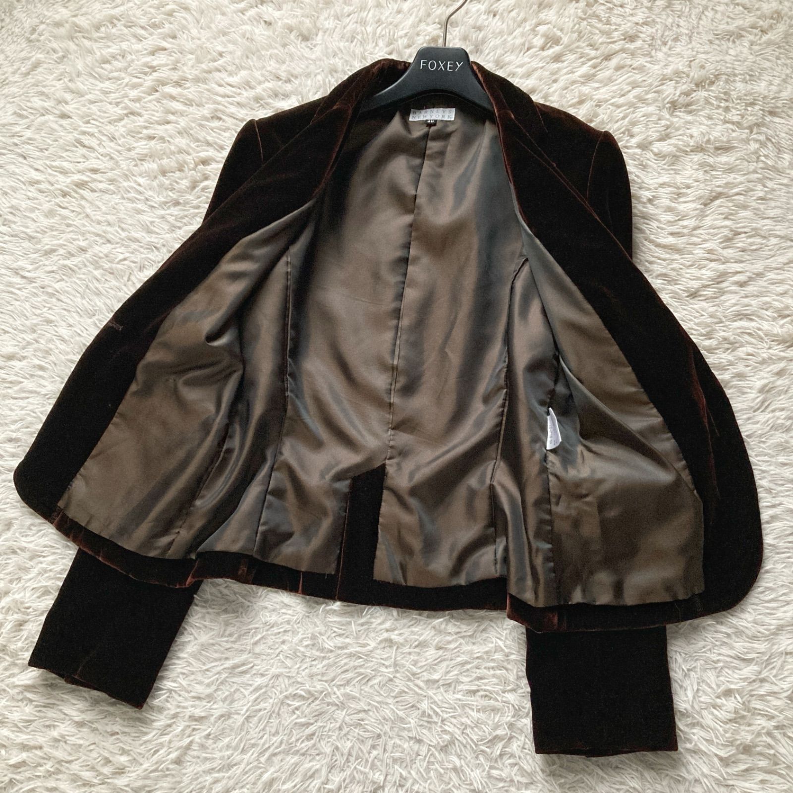 美品 BARNEYS NEWYORK バーニーズニューヨーク 上品 高級感 ベロア ベルベット テーラードジャケット スーツ 極上 ダークブラウン 茶色 レディース 40サイズ シルク レーヨン パーティー ビジネス 羽織り