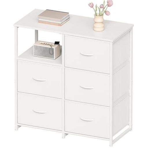 【大容量の収納スペース】:5つの大きな引き出しで、様々なアイテムを整理して収納できます。シンプルなデザインですが、5つの引き出しは抜群の収納力を発揮します。アクセサリー、書類、おもちゃ、おやつから、タオルや冬物衣類などの大きなアイテムまで、あらゆるものを楽々と収納できます。上部と左上のコーナー棚には、鍵、本、カップ、花瓶、写真なども収納できます。