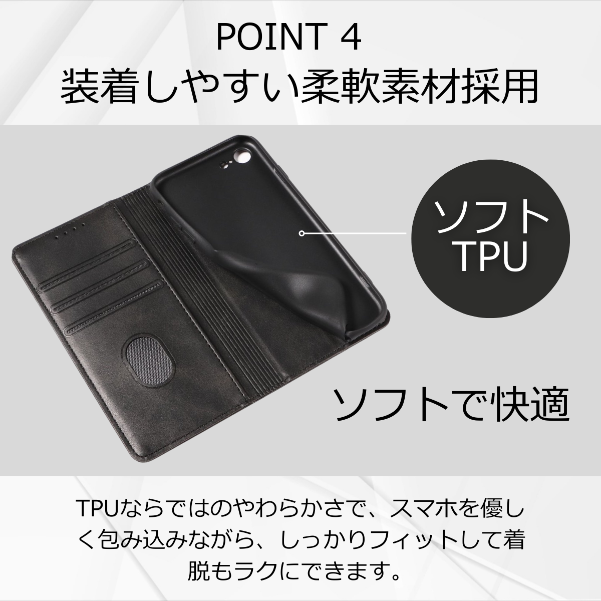 外側は高級感のあるPUレザー、内側は衝撃をやわらげるTPU素材を採用し、大切な端末をしっかり保護します。