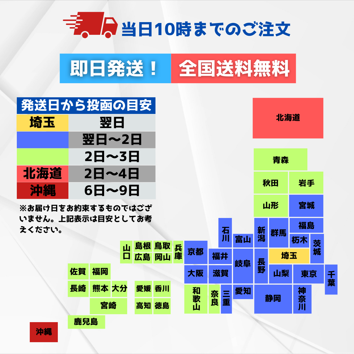 ※通常、発送後1〜2日程度(一部地域を除く)でのお届けとなりますが、天候や交通状況などにより遅延する場合がございます。