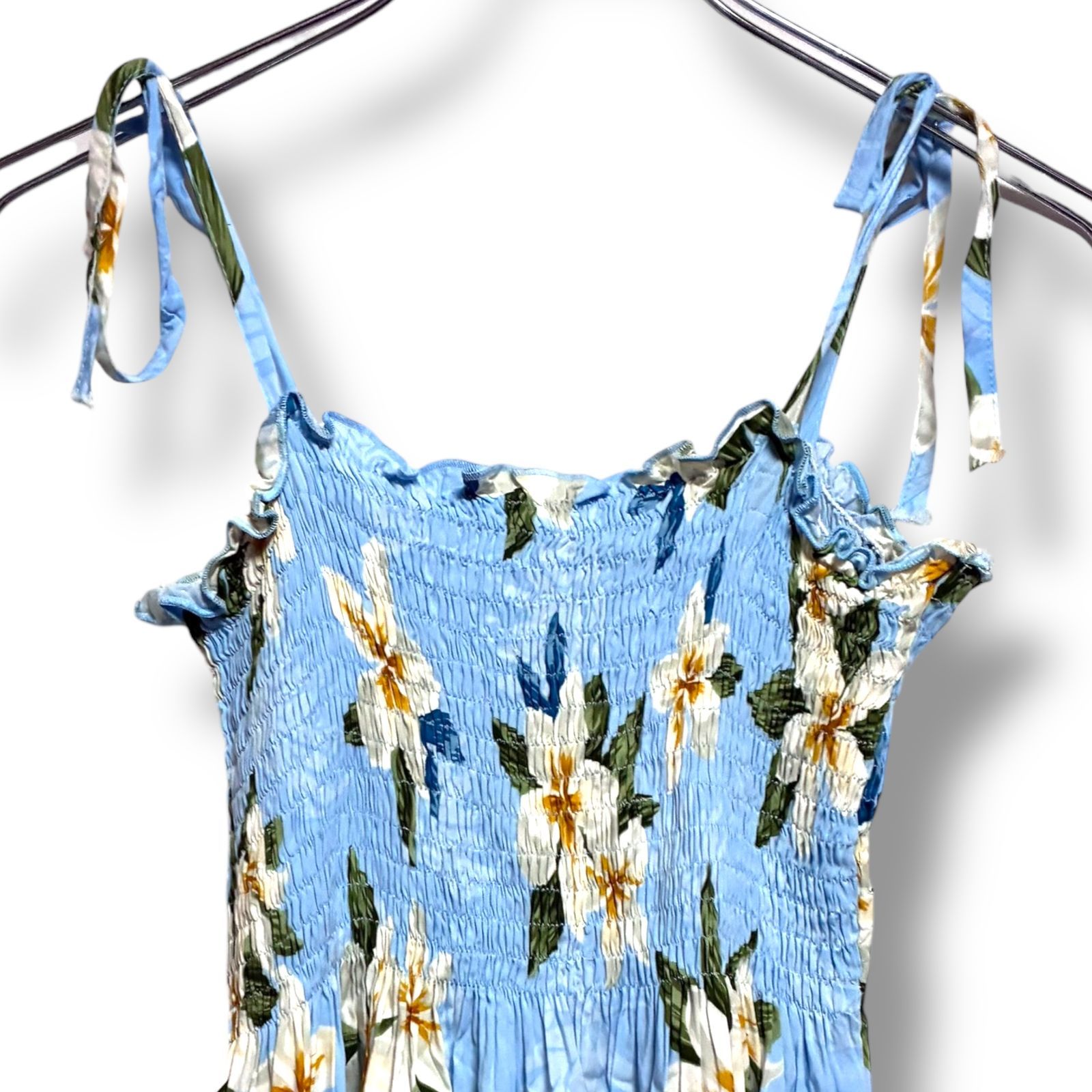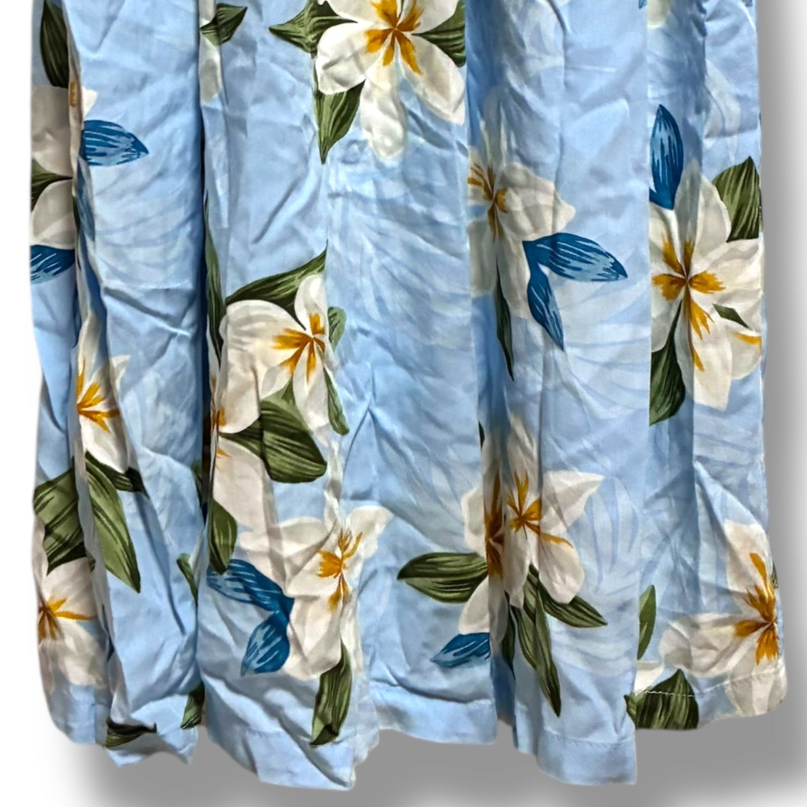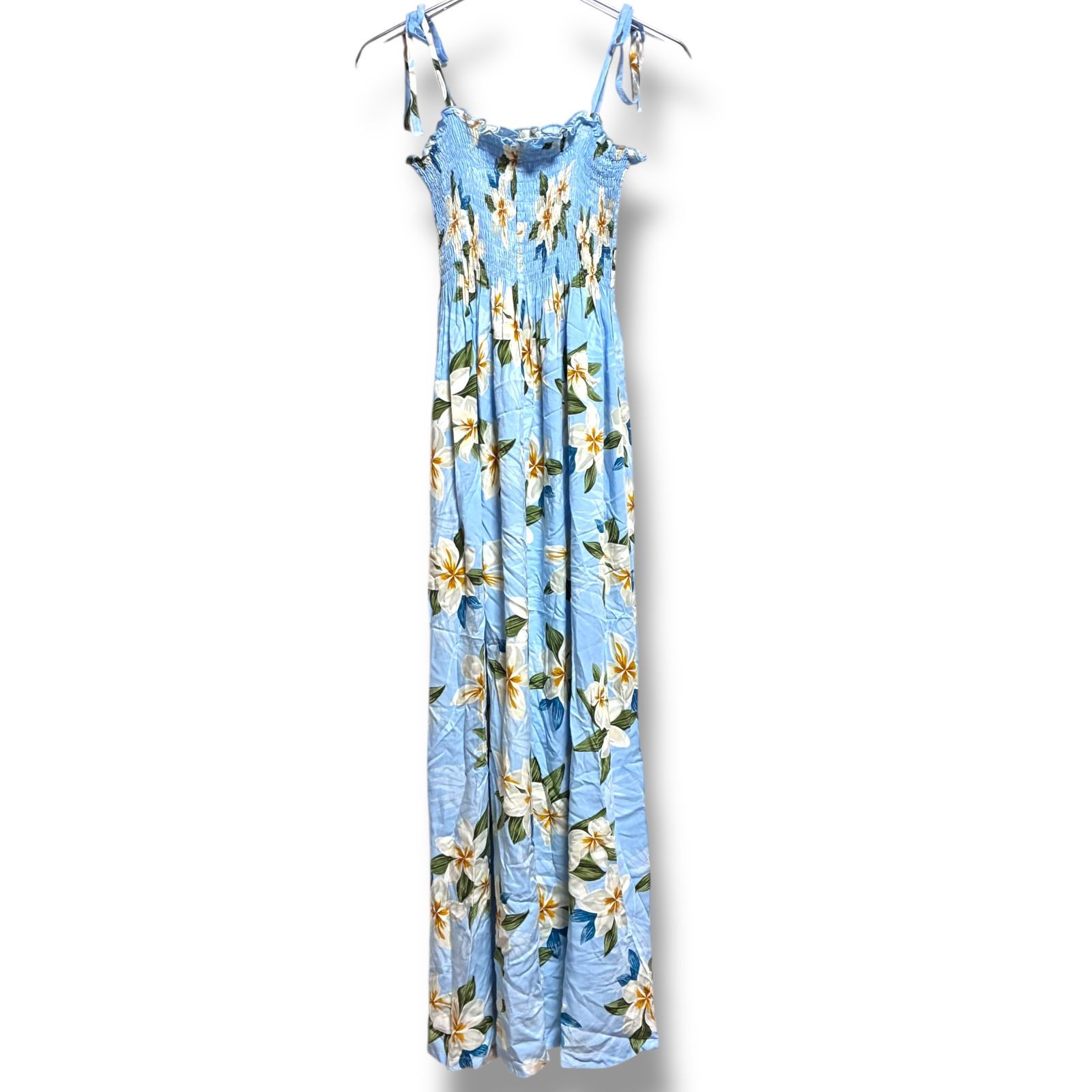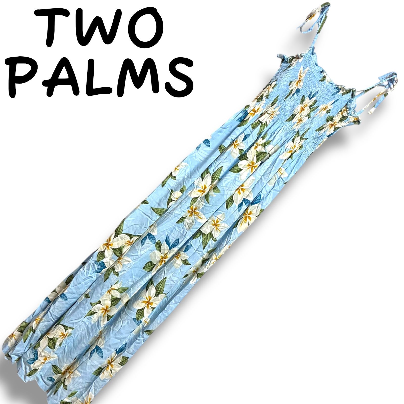 TWO PALMS トゥーパームス ハワイアン キャミワンピース ムームー マキシ丈 フリーサイズ プルメリア 花柄 スカイブルー 水色 ホワイト イエロー シャーリング レーヨン100% ハワイ製 ロングワンピ レディース 001337H