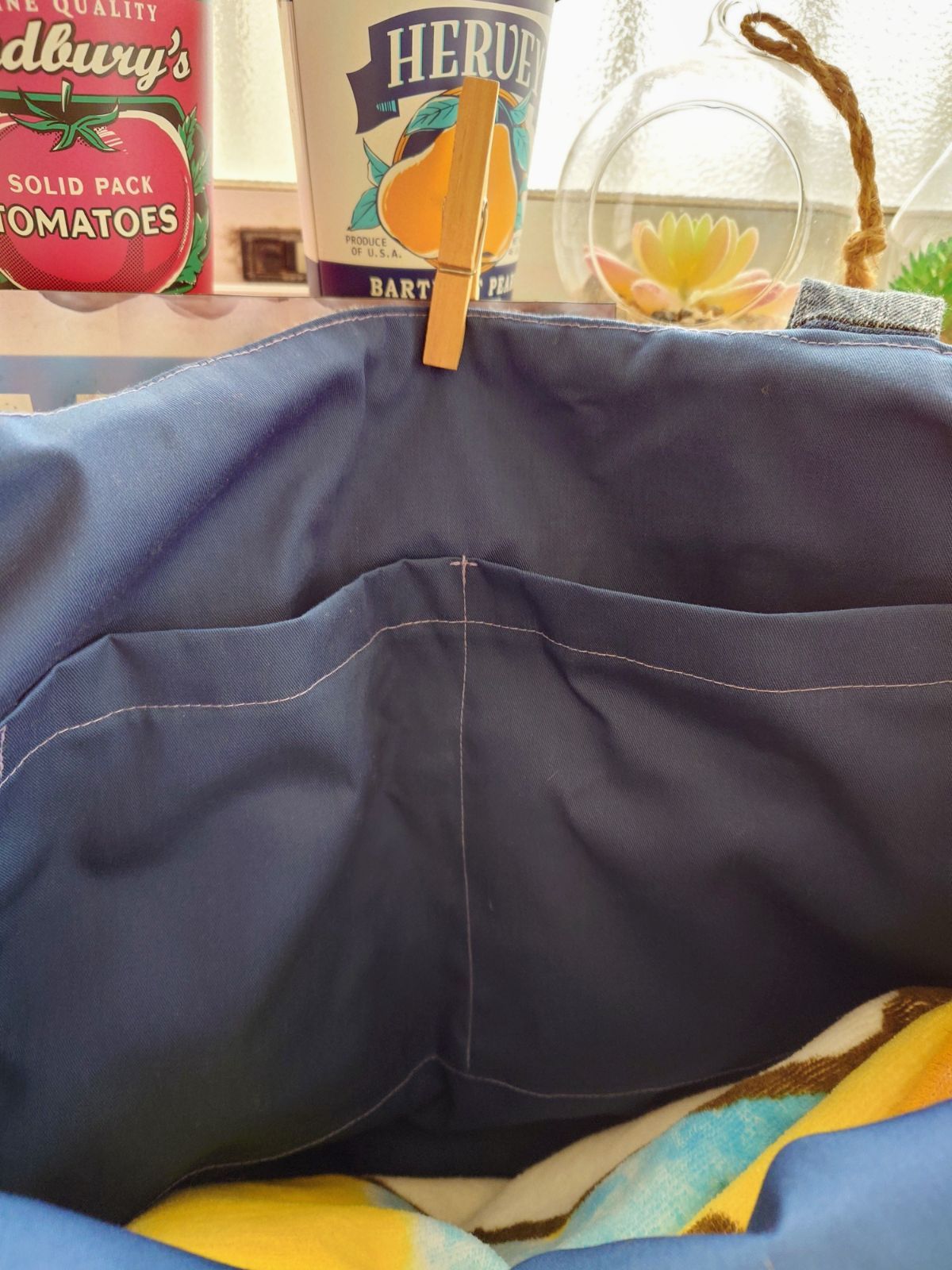 この大きめトートバックはユーズドデニムやシャツをリメイクして作っておりまして、耐久性があり、お出かけ用に最適です。