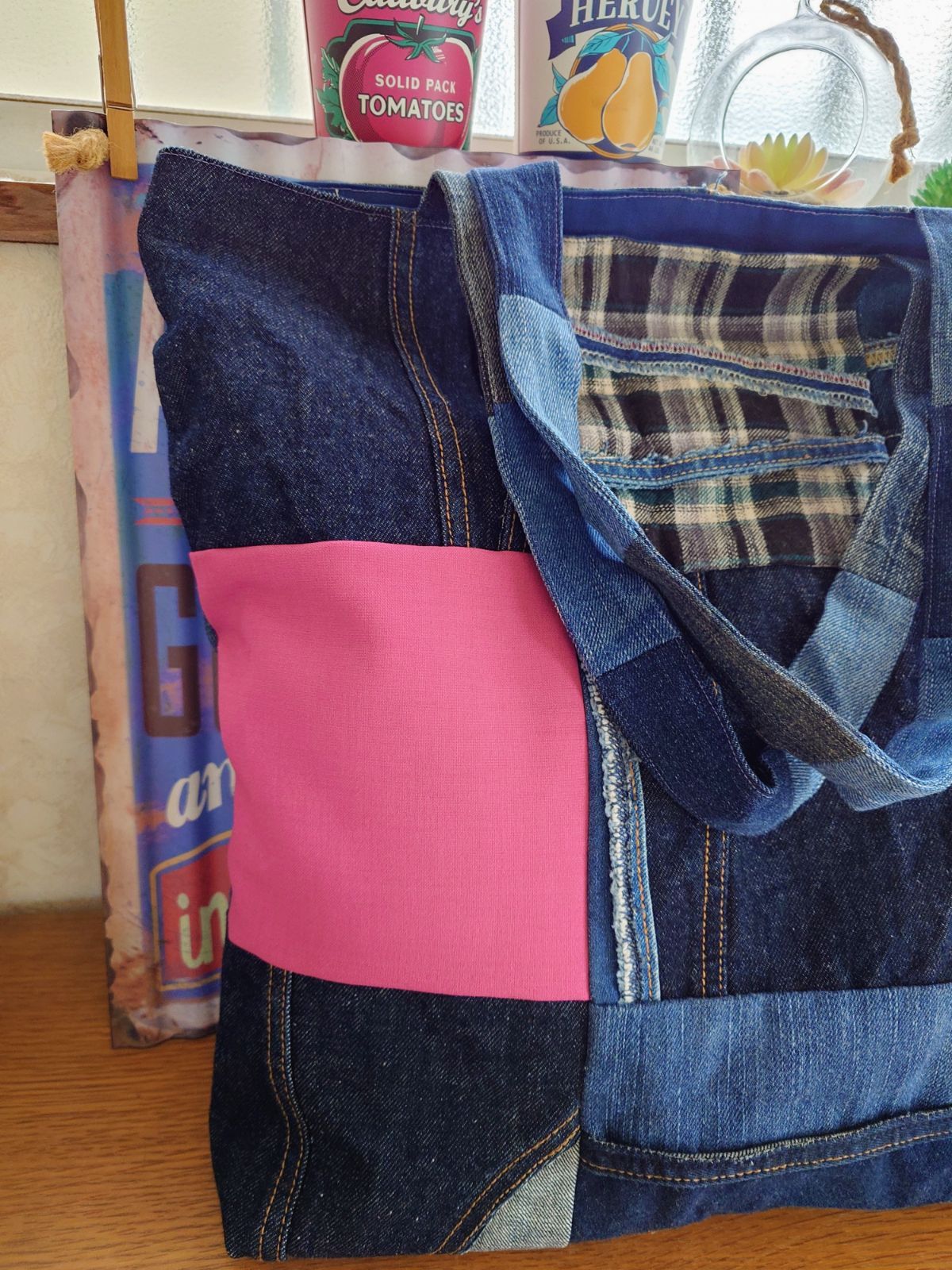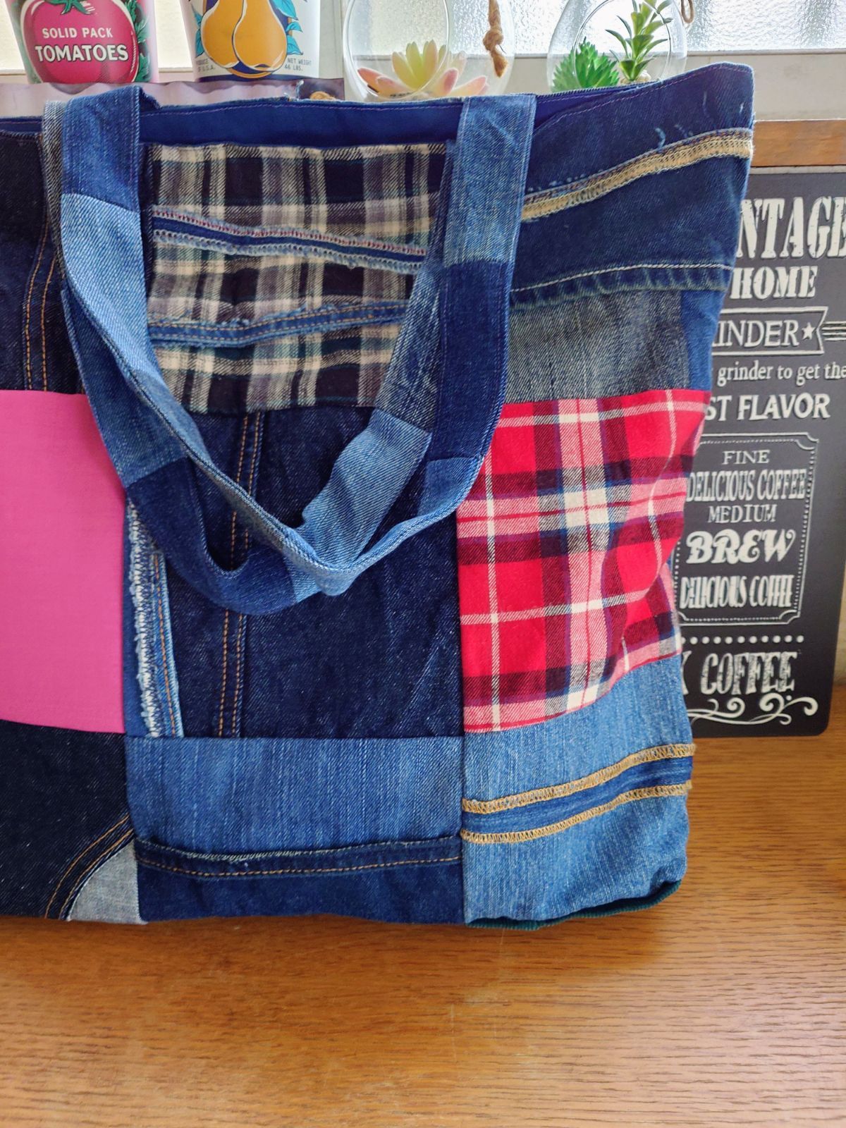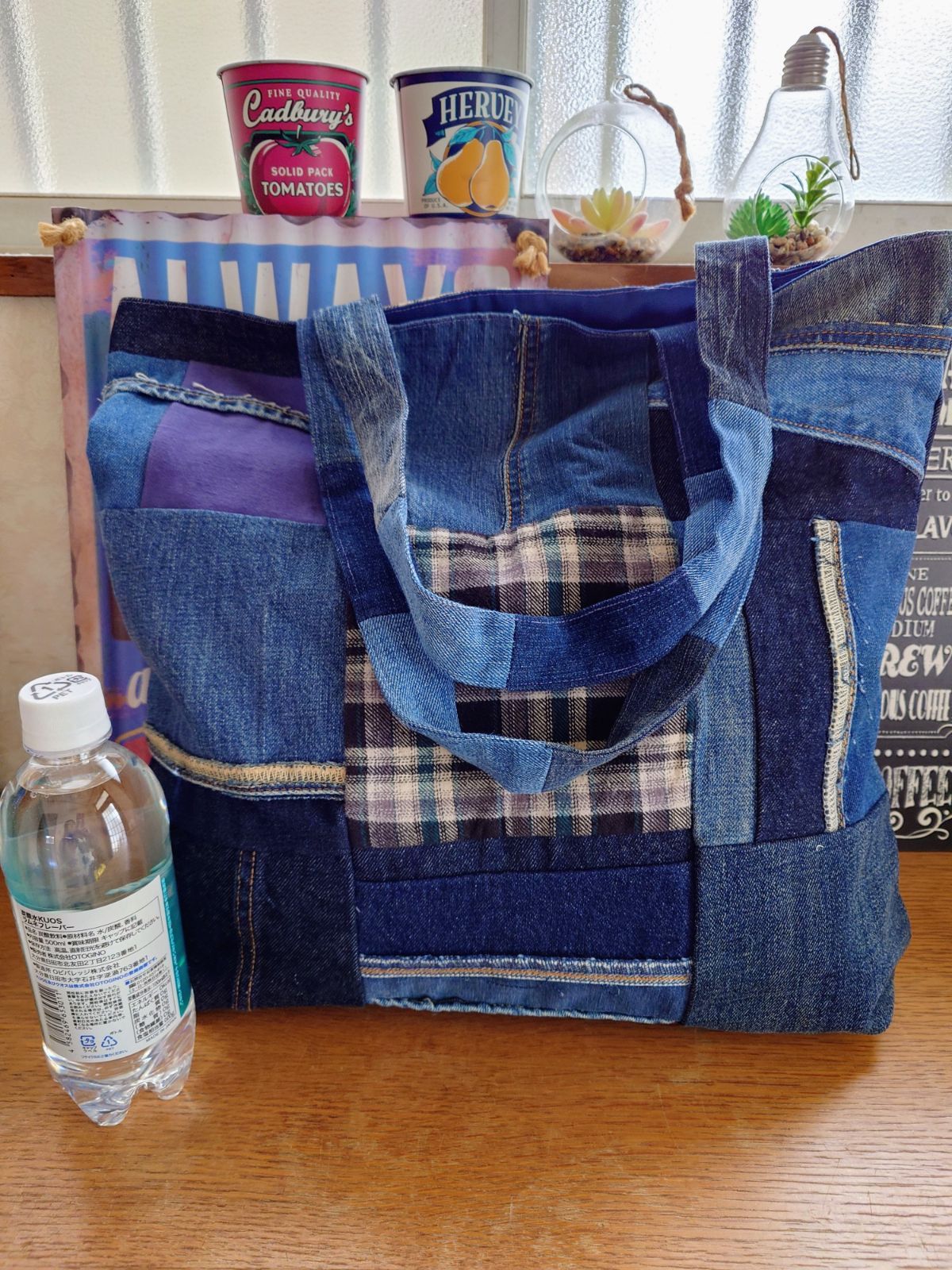 64★USEDデニムリメイク★大きめトートバッグ★パッチワーク★ジーンズリメイク★ジーパンリメイク★