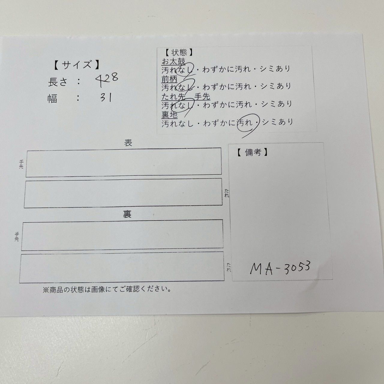 検品表を画像に入れております、ご確認をお願い致します。