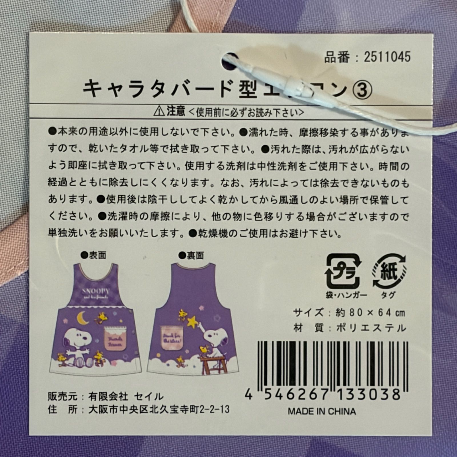 【スヌーピー】 ダバード型エプロン 保育士 介護士 看護師 家庭用 動きやすいエプロン