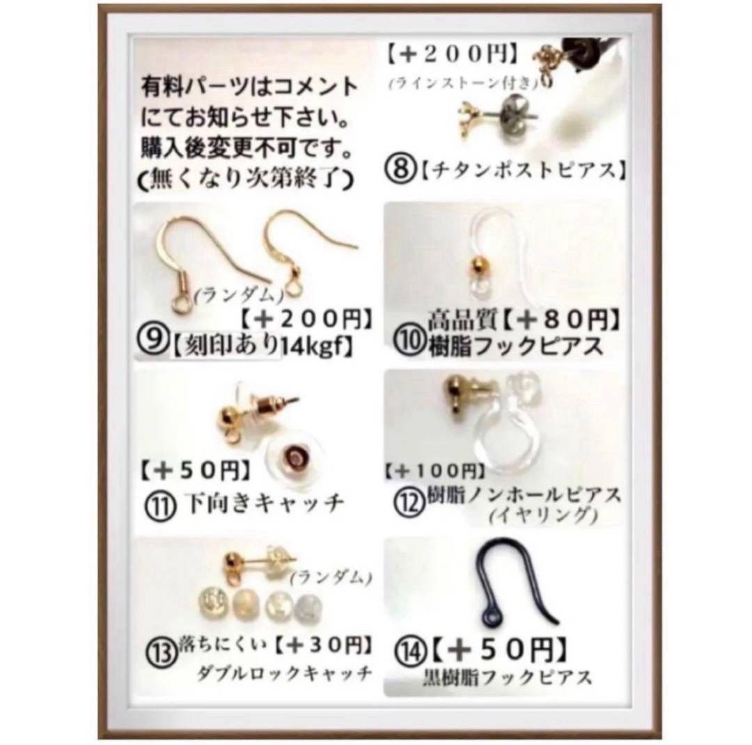 ⚠️パーツ変更の場合、パーツの穴の向きが違う場合は丸カンを追加か減らすか多少変更して発送致します。また、パーツを通す穴が小さい物は丸カン細い物に変更などして発送します。【バランスを見て調整します。】特に樹脂パーツは穴が小さいため丸カン増やすことがありますので、気になる方は一度完成品見たい場合、購入前にコメント下さい。