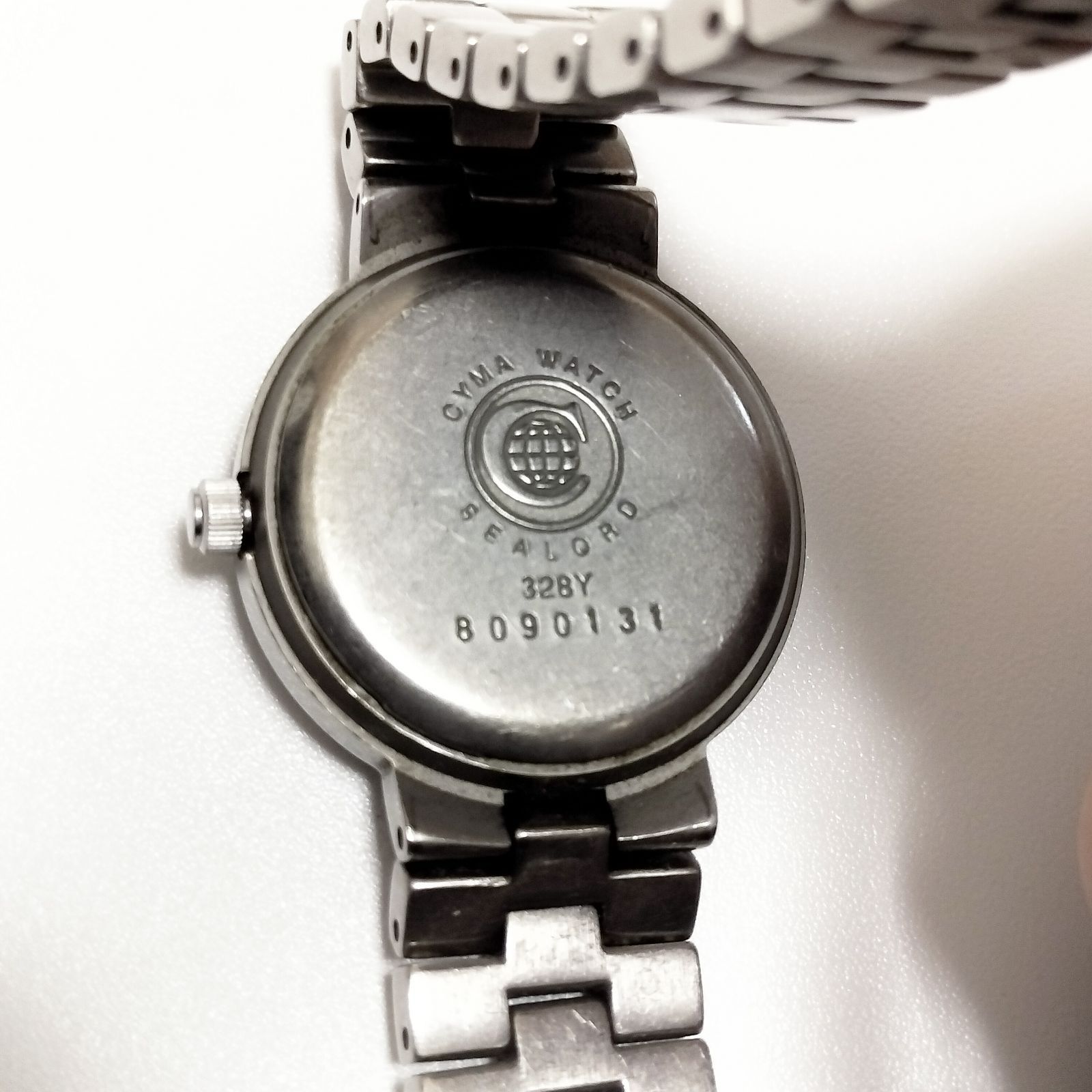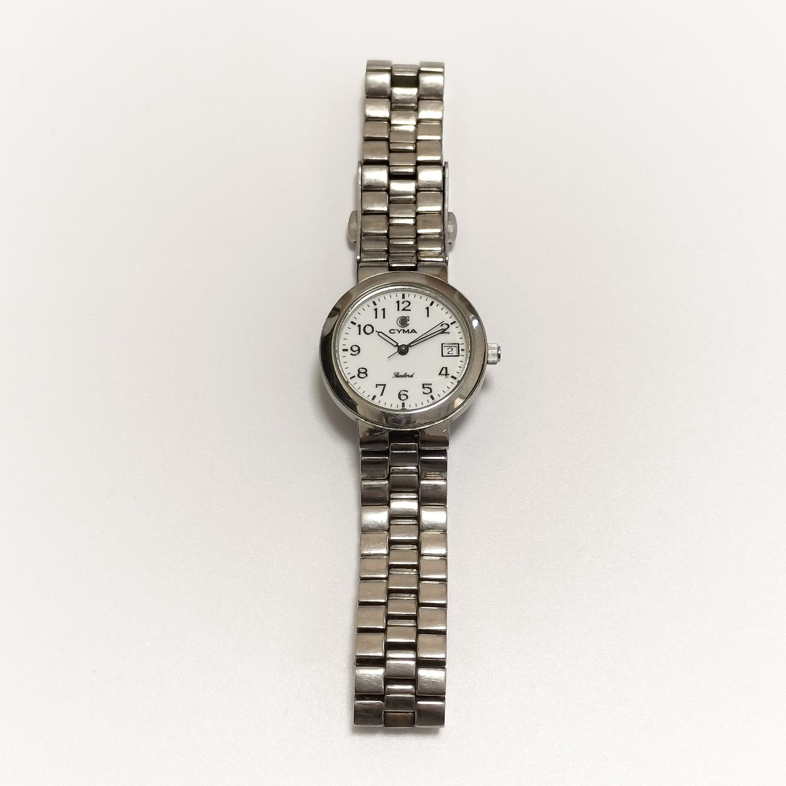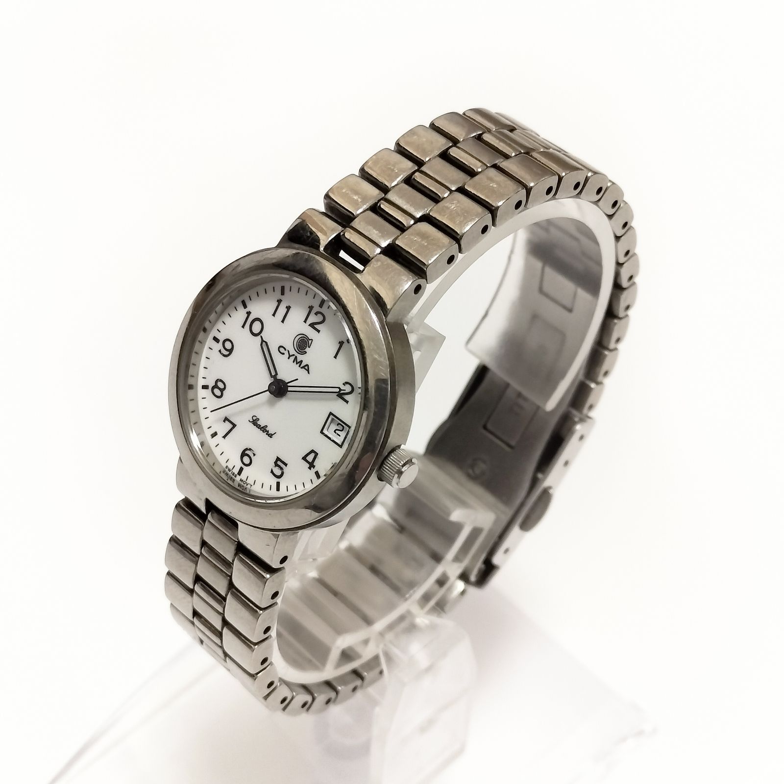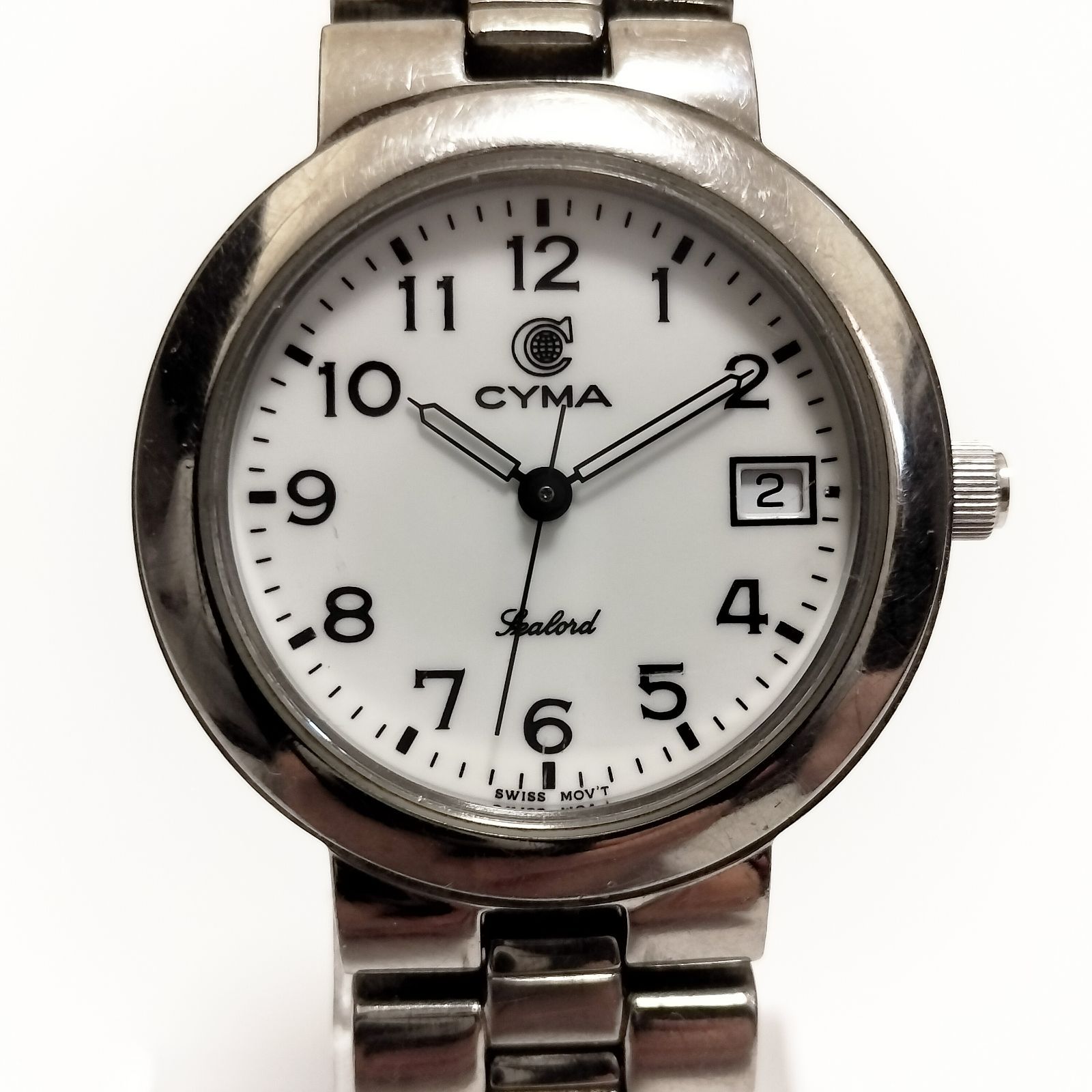 CYMA シーマ メンズ腕時計 クォーツ スイス デイト ホワイト文字盤 メタルブレス 実用時計 Y2K 90s 00s