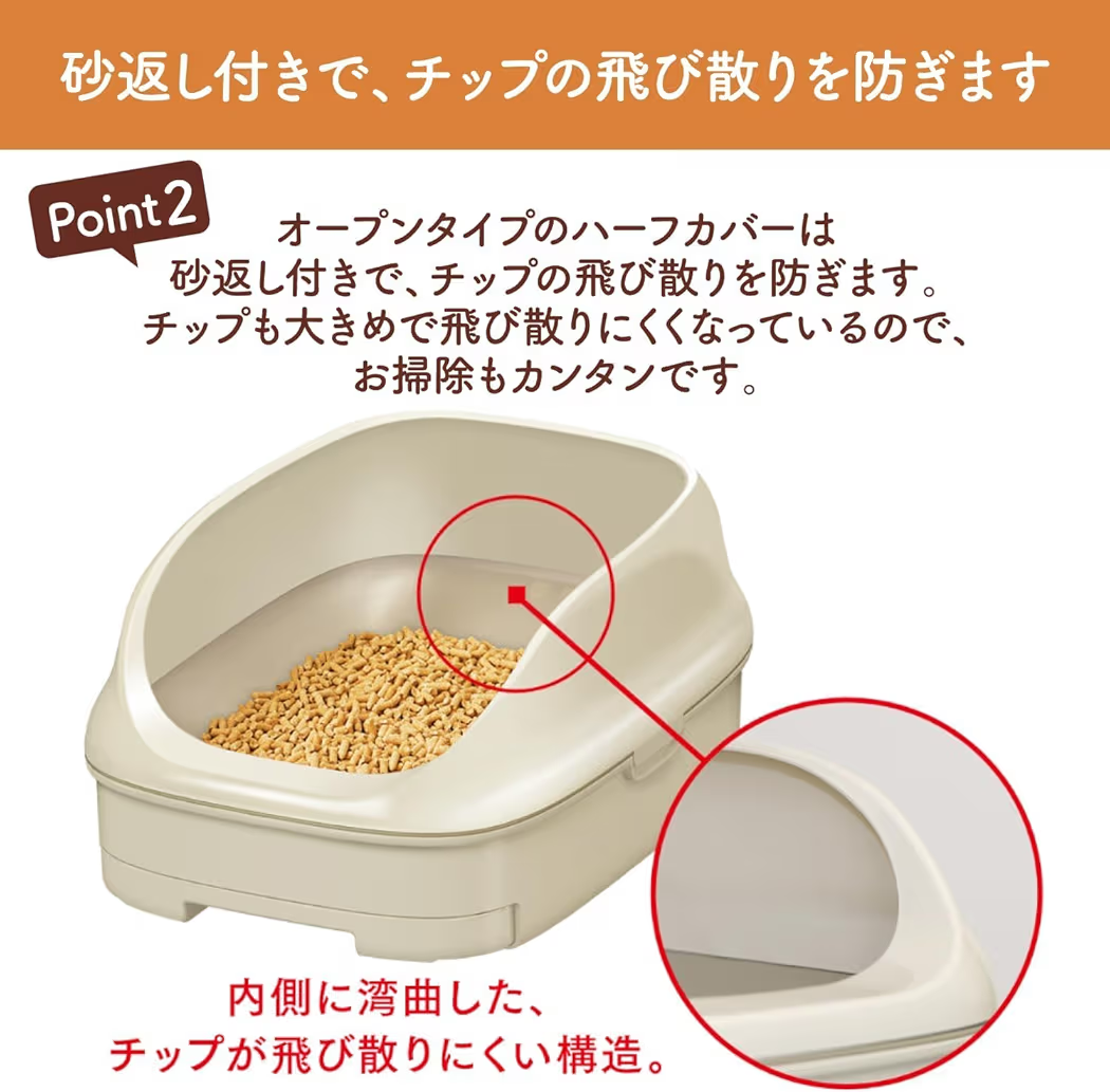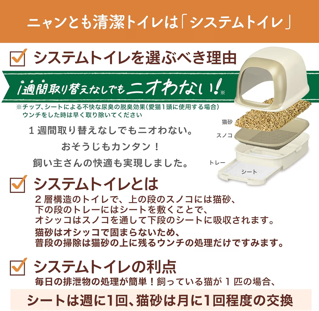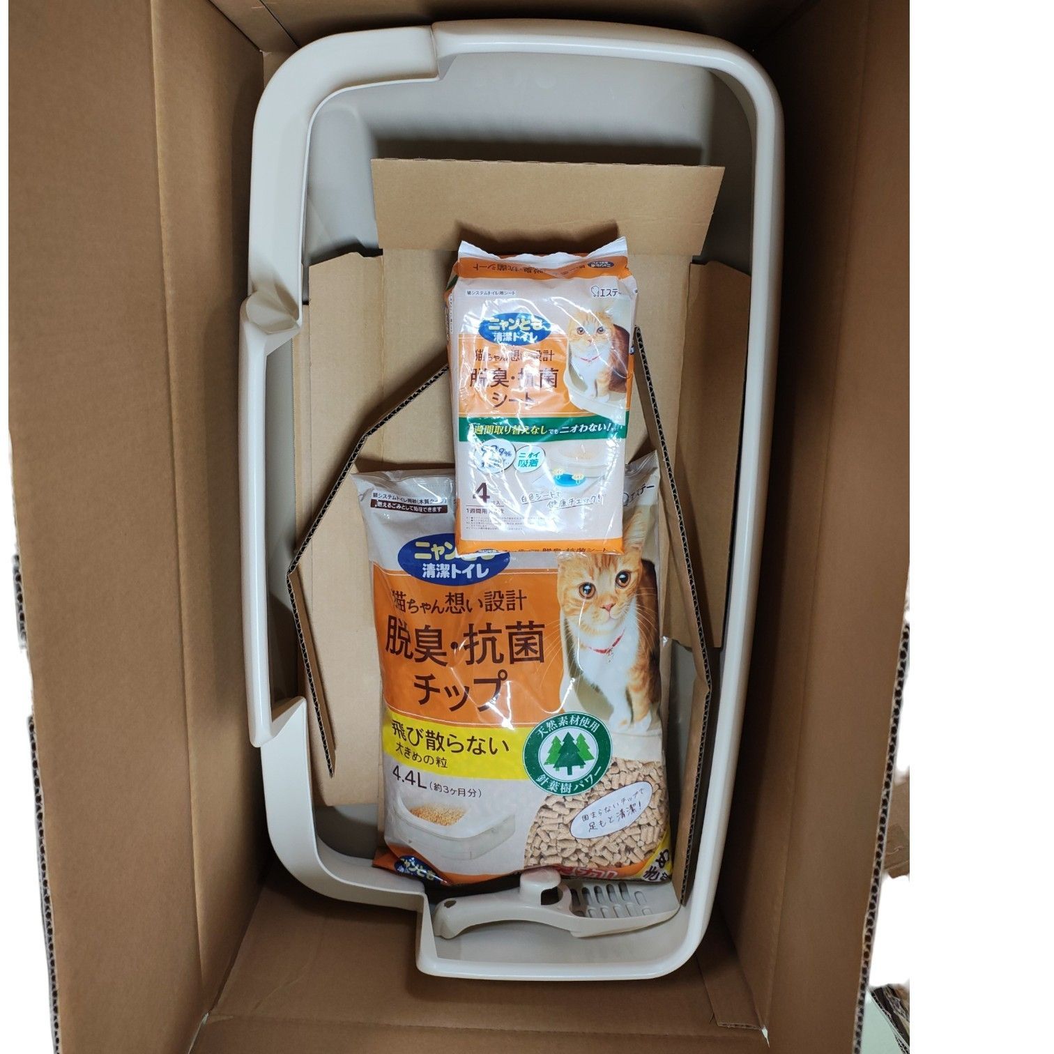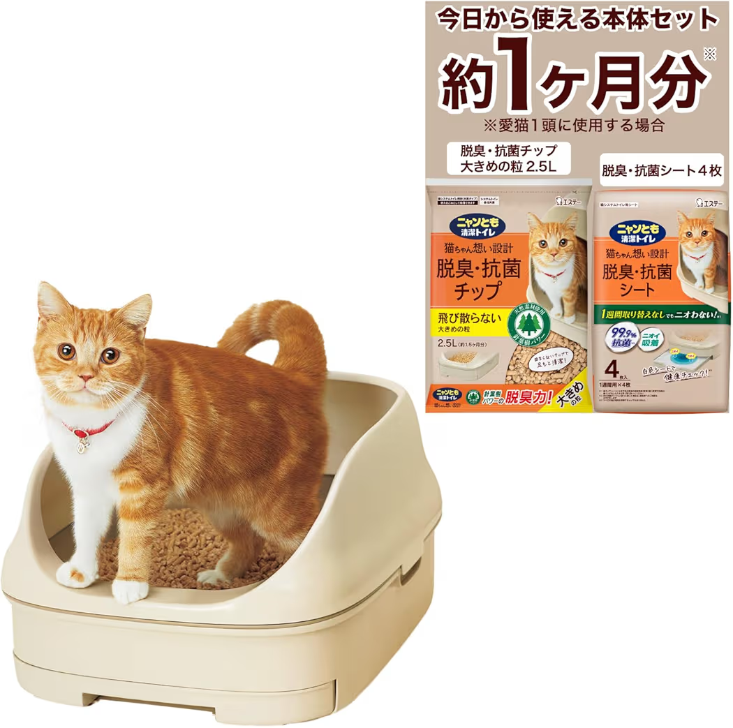 【セット内容】猫システムトイレ本体1組(ハーフカバー、スノコ、 引き出し付きトレー、 専用スコップ)、脱臭・抗菌チップ 大きめの粒2.5L(約1.5ヶ月分)、脱臭・抗菌シート 4枚入り(約1ヶ月分)