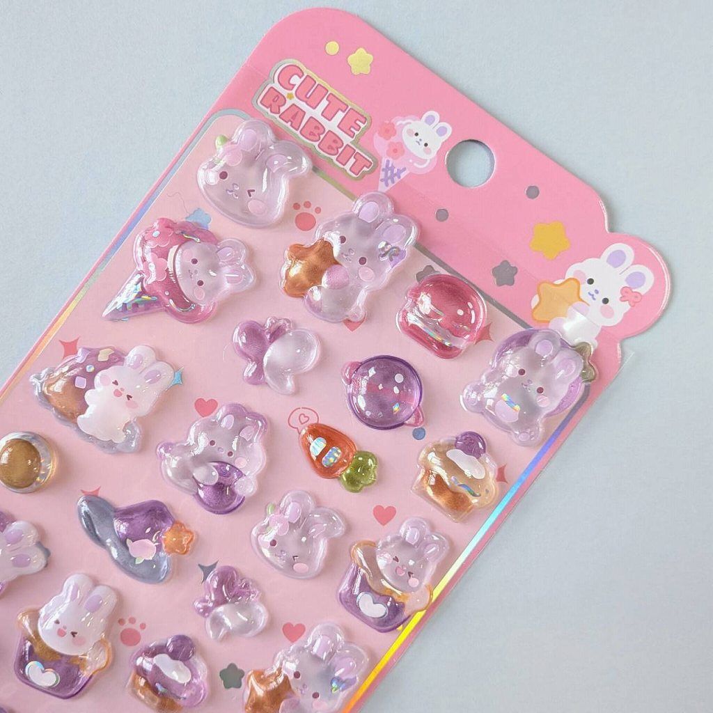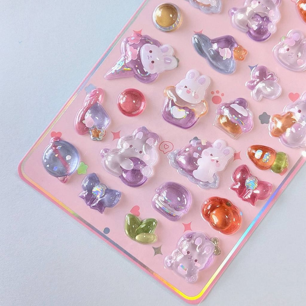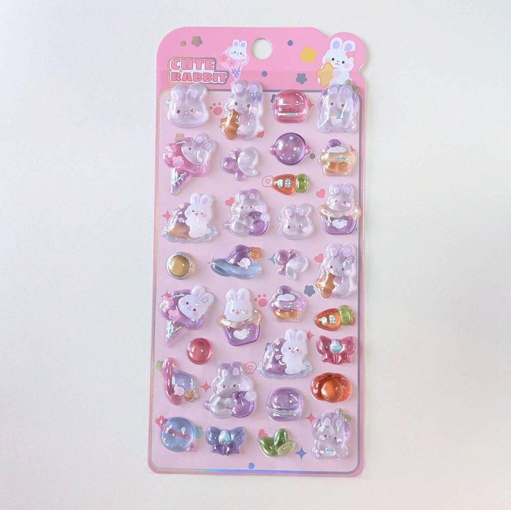 ステッカー 3D立体シール キュートラビット ピンク パープル うさぎ アイスクリーム ケーキ にんじん 紫色 ボンボンシール ドロップシール 3Dシール ぷくぷく シール交換 キラキラ かわいい 人気 St-08 ビーズクラブ