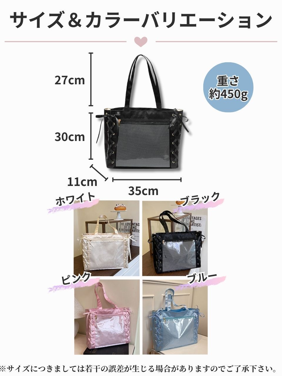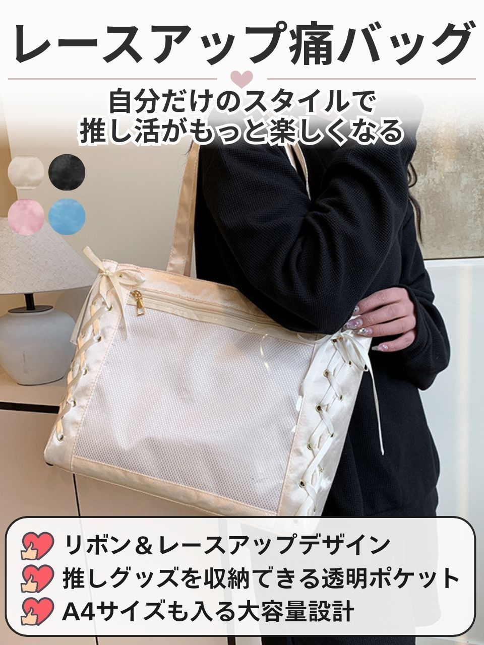 サイドにあしらわれたレースアップのリボンが印象的な、女性らしいトートタイプの痛バッグです。程よく甘さのあるデザインで普段使いにもお出かけにも馴染みやすく、ファッションのアクセントとしても活躍します。シンプルなコーディネートにプラスするだけで、自分らしさを演出できます。